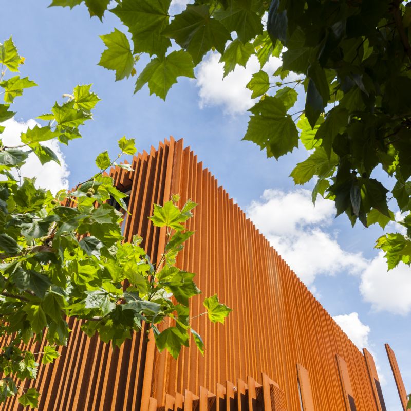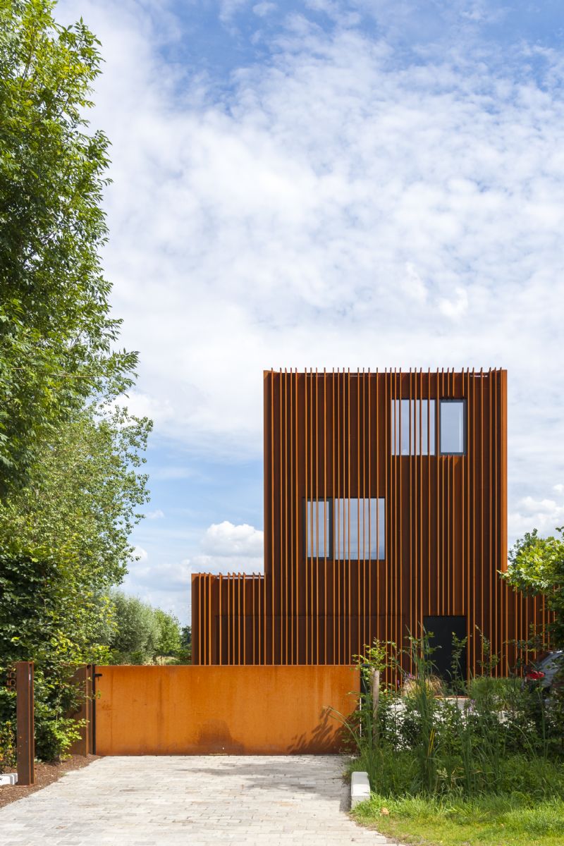 De uitgesproken verticaliteit die door het torentje gecreëerd wordt, wordt extra benadrukt door de Cortenstaallamellen op de gevel. Het idee voor deze specifieke façade kwam van de bouwheer zelf. Het natuurlijke patina en de oranjerode roostkleur van het Cortenstaal vielen meteen in de smaak.