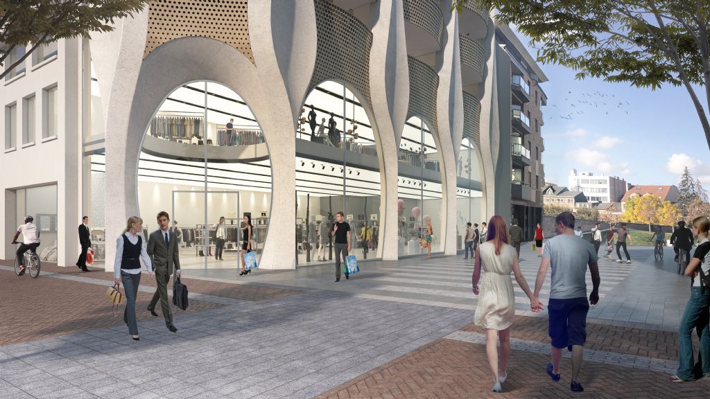 Het Molenpoortplein in Hasselt krijgt een nieuw architecturaal baken. Twee gebouwen aan de Demerstraat ruimen plaats voor een handelspand en luxe-appartementen op de bovenverdiepingen. In het oog springen de organisch gevormde kolommen die een interessante wisselwerking aangaan met de gebogen terrassen. Het ontwerp is van de hand van MaMu Architecten.