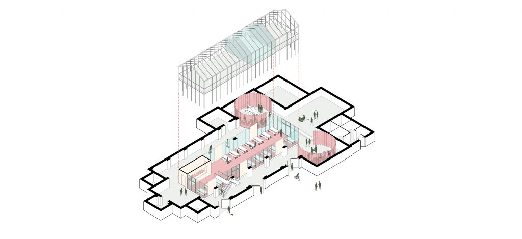 Er ontstaat een rondgang rond het volume die opdeling toelaat in verschillende zones. Zo worden de zijbeuken een plaats voor ontmoeting, expositie, een overdekte speelplaats en voor- en naschoolse opvang. De dwarsbeuk wordt een flexibel in te richten ruimte in functie van specifieke lessen of schoolmomenten.