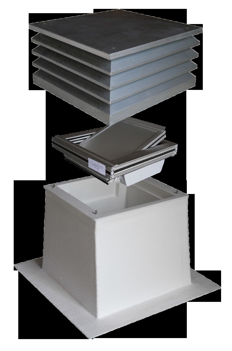 Deze oplossing is in verschillende maten verkrijgbaar, waardoor ze op alle liftschachten en technische kokers met een standaard opening past. De bescherming tegen de weersinvloeden wordt verzekerd door een verwijderbaar deksel met jaloeziekleppen dat bovendien met een insectenhor is uitgerust. De dakkoepel is in meerdere RAL-kleuren verkrijgbaar, zodat ze gemakkelijk aan de geplande architecturale esthetiek kan worden aangepast.