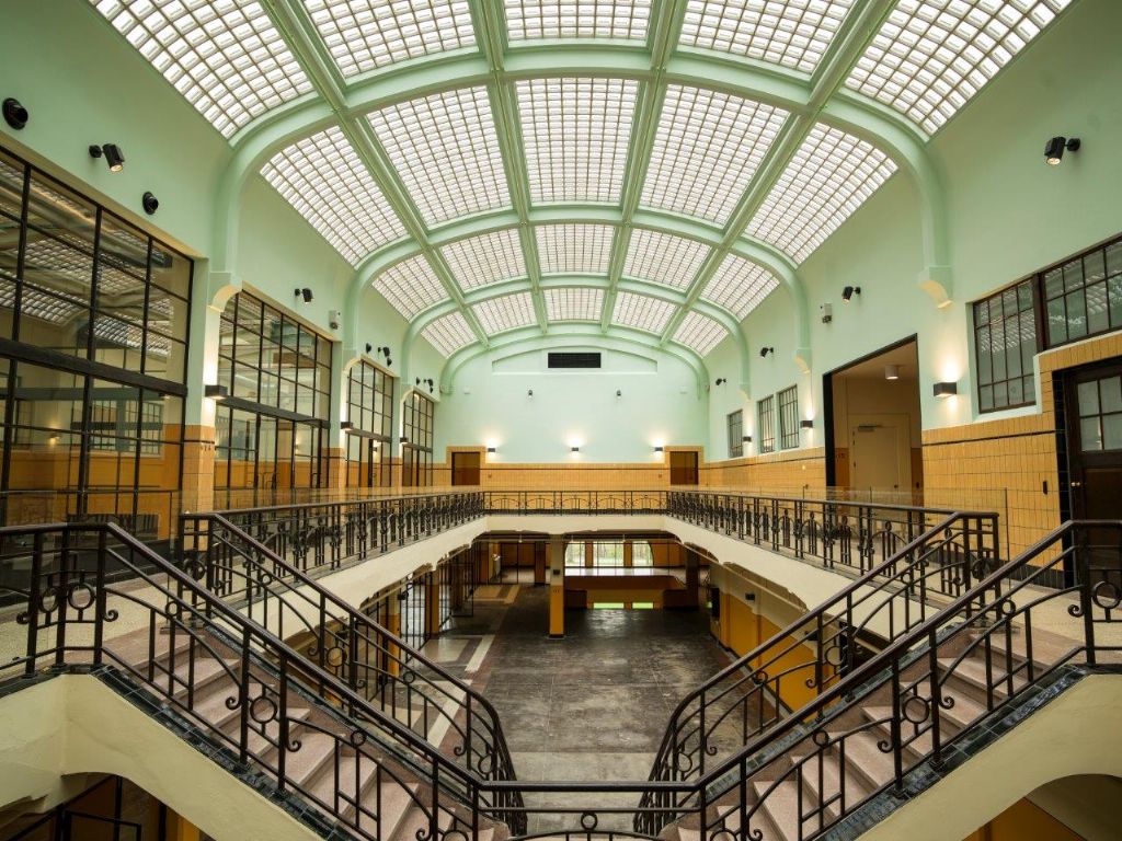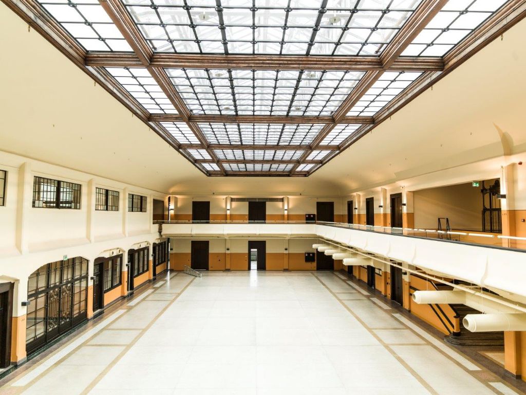 Voor de restauratie was dit een sombere ruimte, vermits het prachtige glastegeldak verstopt werd door een roofingdak. Zowel de glastegels als de betonconstructie waren te zeer beschadigd om ze nog te herstellen. De glastegels bleken ook niet meer beschikbaar te zijn en dus werd er speciaal voor dit project een mal ontworpen om nieuwe glastegels te kunnen gieten. Boven dit glastegeldak, maar door het diffuus licht niet zichtbaar van binnenuit, werd als extra bescherming een tweede glazen kap gerealiseerd.