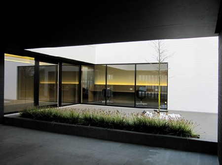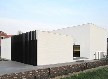 De woning bestaat langs de buitenkant uit wit geschilderde gevelsteen en is in feite een monoliet met insnijdingen. De patio, die toegankelijk is via een inham aan de rechterzijde van het volume, wordt er in het centrale gedeelte uitgelicht. Hij scheidt het dienstgedeelte aan de straatzijde van het woongedeelte aan de tuinzijde. Een verbindingsgedeelte naar het hogere woonvolume overdekt de inkomhal met voordeur die uitloopt op de patio. Het strakke lijnenspel komt er volledig tot uiting en zorgt voor een gevoel van rust. Z’n buitenbevloering in gevlamde basalt loopt langsheen de woning verder naar de tuin en vloeit daar over in het terras. Grote raampartijen leggen de link naar de inkomhal en het thuisbureau.