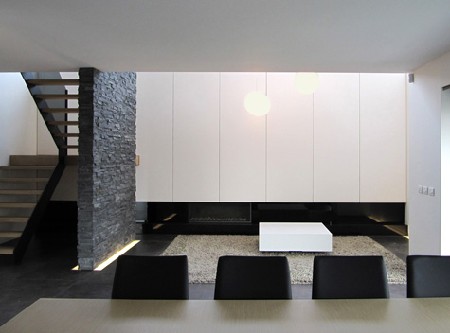 De inrichting werd volledig op maat gemaakt. Zwarte en witte kleuren overheersen, terwijl de indirecte verlichting op de kast en in de vloer de ruimte en de leisteen ’s avonds in een warme gloed doet baden.