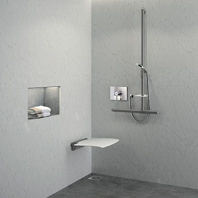 In neergeklapte positie biedt het opklapbare douchezitje een zitplaats met comfortabele afmetingen, terwijl de strakke lijnen zorgen voor een discrete uitstraling. Zo kan het zitje, eenmaal in verticale positie, integreren in de omgeving.