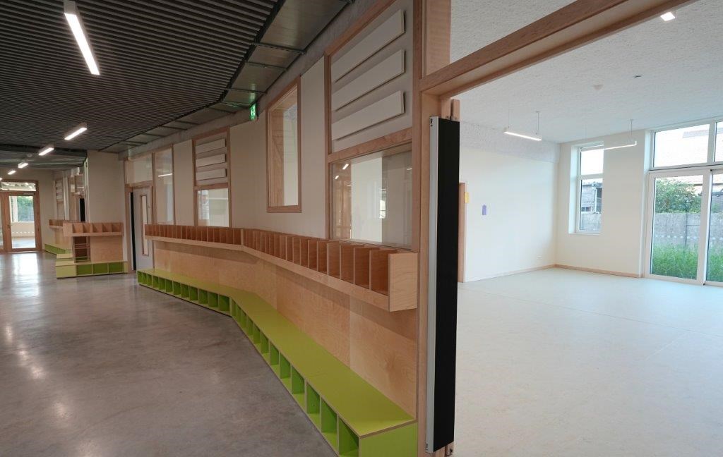 Eveneens opmerkelijk: GBS De Stip is een school zonder fossiele brandstoffen. Er is resoluut geopteerd voor zuinige technieken op basis van hernieuwbare energie: een BEO-veld, geothermische warmtepompen, betonkernactivering, PV-panelen … “Ook in dat opzicht lag de lat dus hoog”, geeft Kurt Van Hooydonk aan. “De energievraag hebben we gereduceerd via een uitgekiende combinatie van compactheid, oriëntatie, isolatie en zonwering. Daardoor is er evenmin nood aan actieve koeling. De technische ruimte staat op een zichtbare plek met een binnenraam. Zo maken we leerlingen en gebruikers warm voor techniek en duurzaamheid, wat kadert in het participatieve karakter van het project. Via talloze overlegmomenten hebben we ons ingezet voor de creatie van een gemeentelijk draagvlak, zodat iedereen dit gebouw kan appreciëren. Dat is evenzeer een vorm van duurzaamheid, net als de bevordering van het gebruikscomfort via een overvloedige natuurlijke lichtinval. Rekening houdend met de betonkernactivering hebben we ook veel aandacht besteed aan de akoestiek. Aangezien de betonnen vloerplaten niet of slechts deels bedekt zijn, zijn er aangepaste akoestische materialen zoals wandabsorbers in houtwolcement, baffels in vilt, spuitpleister enzovoort toegepast. Kortom: niets is aan het toeval overgelaten en dat werpt zijn vruchten af.”