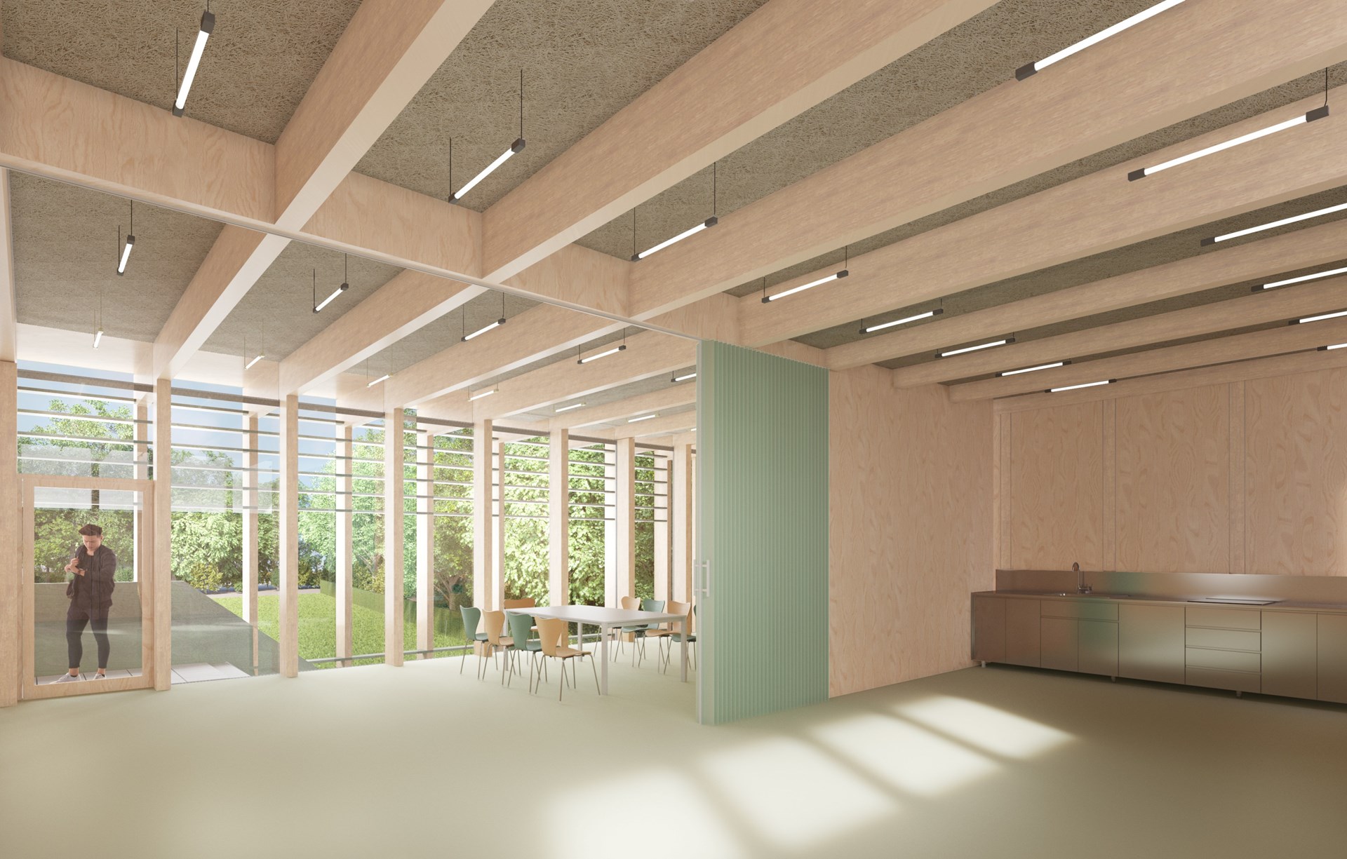 De bebouwde oppervlakte blijft binnen dit project beperkt. Het nieuwe gebouw met een footprint van 565m² is een houtskeletbouw met lichte invulwanden, open kolommen en een balkenstructuur. De ontwerpers werken het toekomstgericht en duurzaam uit door ecologische materialen te gebruiken en zonnepanelen, een warmtepomp en waterrecuperatie voor toiletten en buitenkraan te voorzien. Bovendien laat het ontwerp eventuele aanpassingen in de toekomst toe.