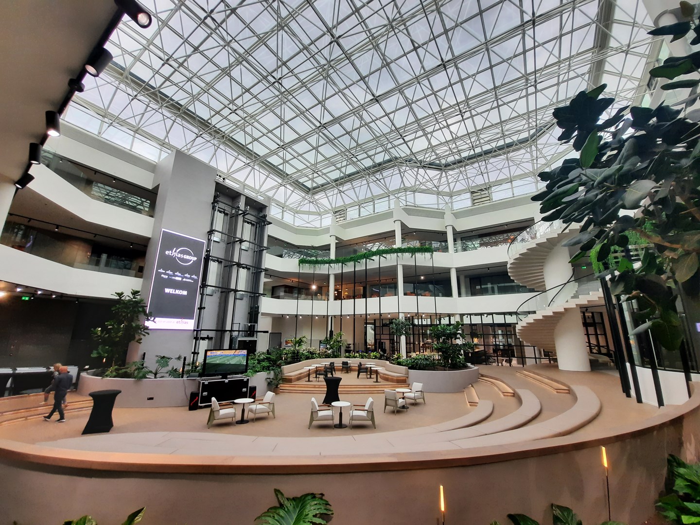 De tweede doelstelling van het ambitieuze renovatieproject was de herinrichting van het interieur. Daarbij was het menselijke aspect erg belangrijk, benadrukt Eric Delgoffe. “Het comfort en het welzijn van de medewerkers was prioritair voor Ethias. In samenwerking met onze interieurarchitecte Solange Cloesen hebben we de evolutie naar ‘new ways of working’, die voordien al voorzichtig was ingezet, verder doorgetrokken door tal van flexibele werkplekken in te richten, afgewisseld met gemeenschappelijke voorzieningen zoals zithoeken, kitchenettes en coffee corners. Transparantie was daarbij het kernwoord. Op de vergaderzalen van de directie na zijn er quasi geen afgesloten ruimtes, tenzij maximaal beglaasd. Het idee van het atrium als kloppend hart van het gebouw hebben we behouden. Vroeger had dat meer de allure van een binnentuin, terwijl het nu hoofdzakelijk is opgevat als een ontmoetingsruimte met enkele groenaccenten. Het beglaasde dak garandeert een overvloedige natuurlijke lichtinval. In combinatie met de gordijngevel zorgt dit ervoor dat de omliggende kantoorruimtes baden in het daglicht, in combinatie met kunstmatige verlichting waarvan de kleurtemperatuur geoptimaliseerd is. Daarnaast hebben we het sanitair aangepast aan rolstoelgebruikers. Kortom: we hebben echt op de details gewerkt en niets aan het toeval overgelaten. Dat heeft zijn vruchten afgeworpen, want bij Ethias zijn ze erg tevreden met het resultaat. Dat je naar verluidt niet kan zien dat het om een gerenoveerd gebouw gaat, is het mooiste compliment dat we als architect kunnen krijgen.”