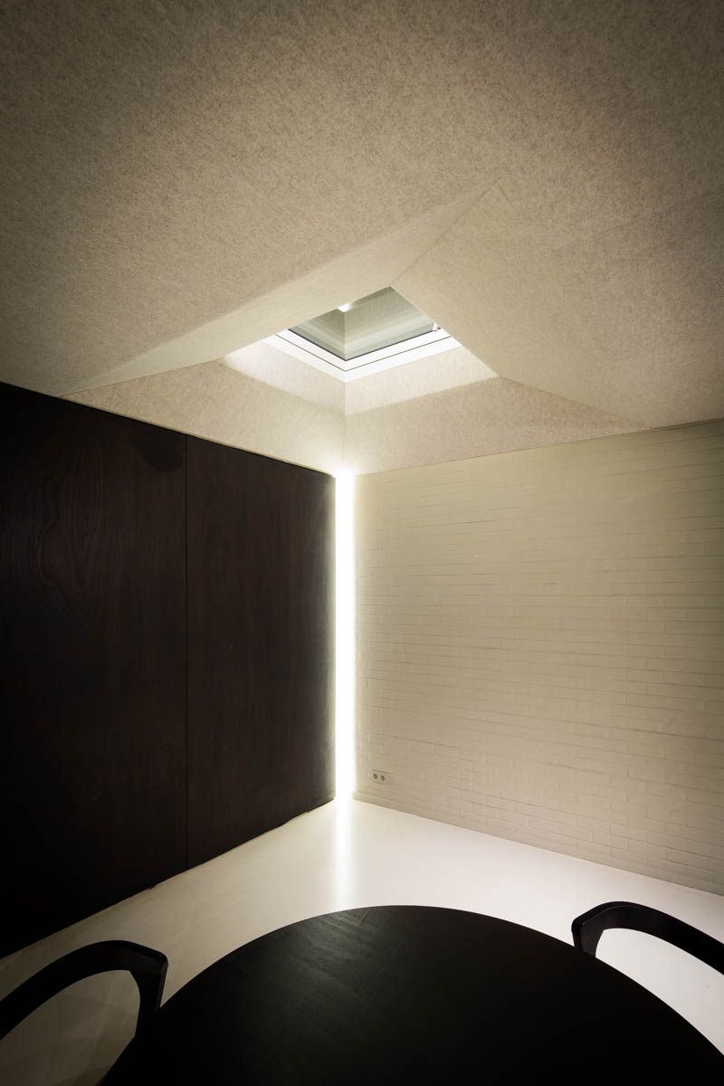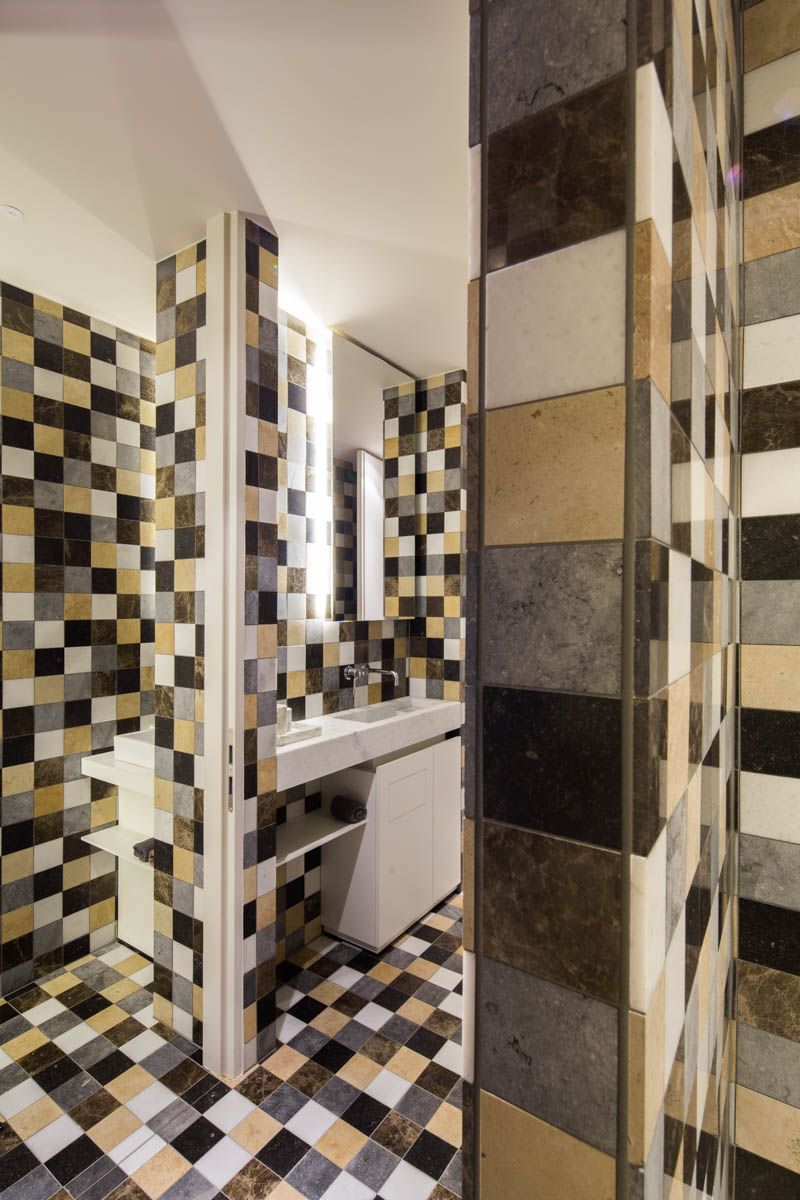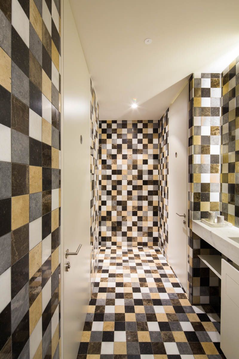 Het vilt op het plafond zorgt, naast de akoestische kwaliteit, voor een zachte en comfortabele indruk. De sobere, rustige materialisatie van het restaurant krijgt een tegenpool in de sanitaire ruimtes. Deze werden gevuld met verschillende natuurstenen kleurvlakken. De kleine marmeren tegels zorgen door de veelheid aan lijnen voor een soort deconstructie van de ruimte, waardoor deze groter aanvoelt.