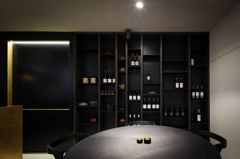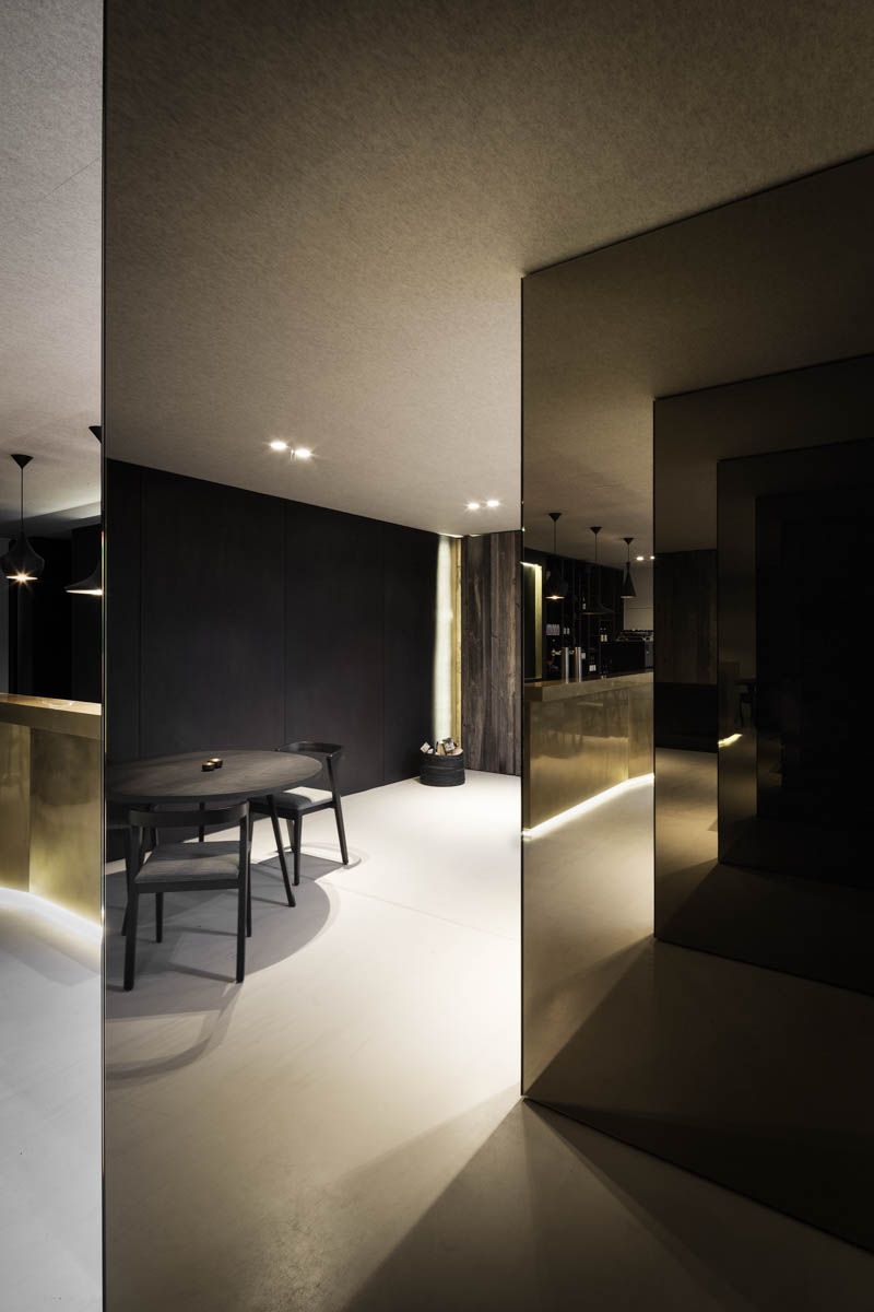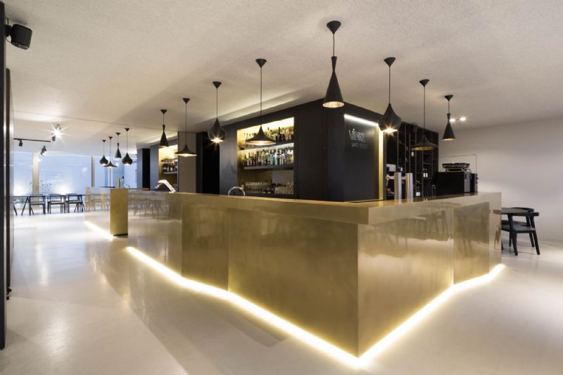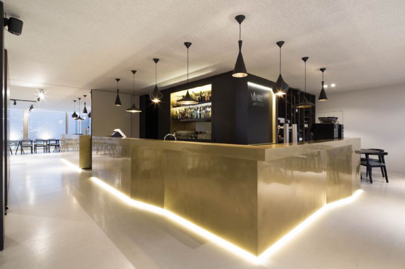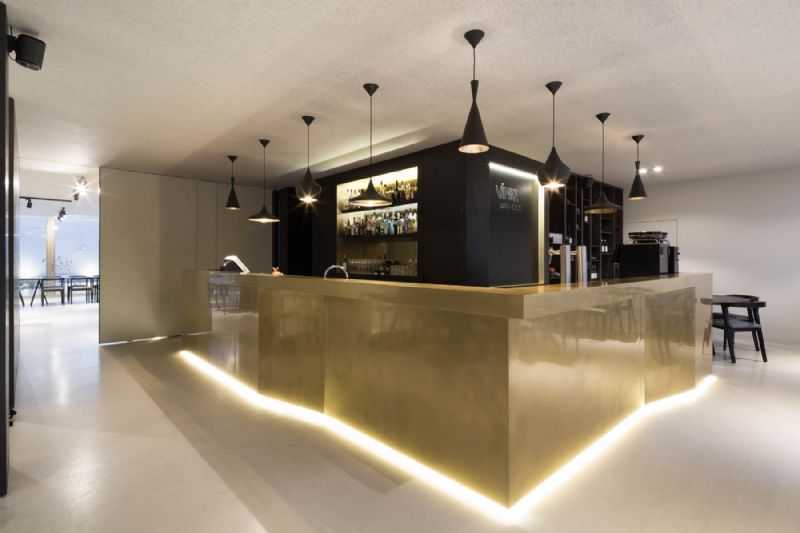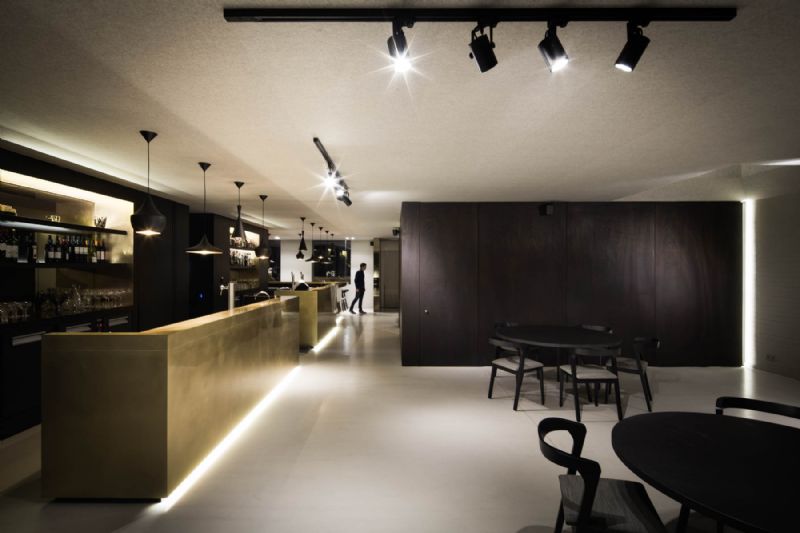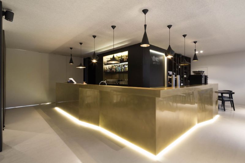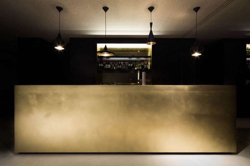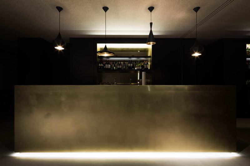 Het verbindende element tussen de verschillende ruimtes, de toog, is opgebouwd uit messing. Dit materiaal verwijst naar de oude tapkranen die men nog kan aantreffen in een bruine kroeg. Het materiaal wordt herhaald in de zwarte toogwand om het werkveld kracht bij te zetten en accenten te leggen.