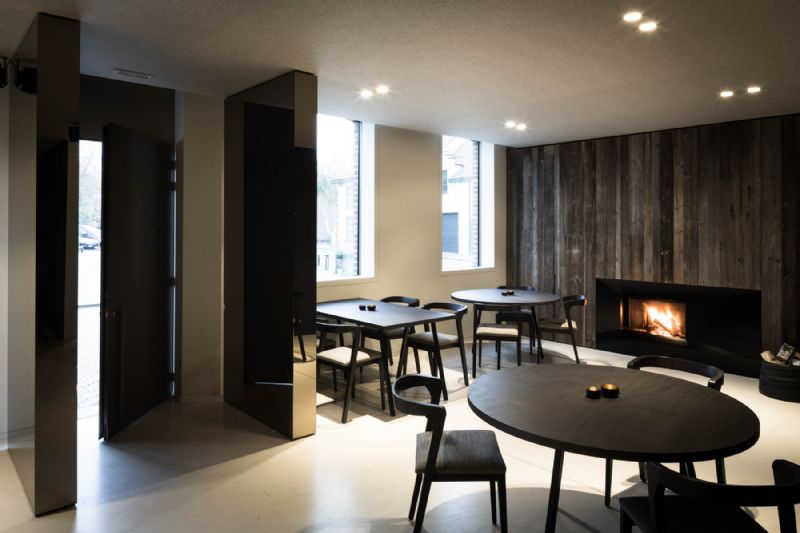Wanneer de gasten het gebouw betreden worden ze ontvangen tussen 2 reflecterende zuilen in gebronzeerde spiegel. Deze elementen zorgen voor een afscheiding tussen de tafels aan de toog en deze die zich bij de gezellige haardwand bevinden. De brandende houthaard verwelkomt de bezoeker met een gevoel van thuiskomen.