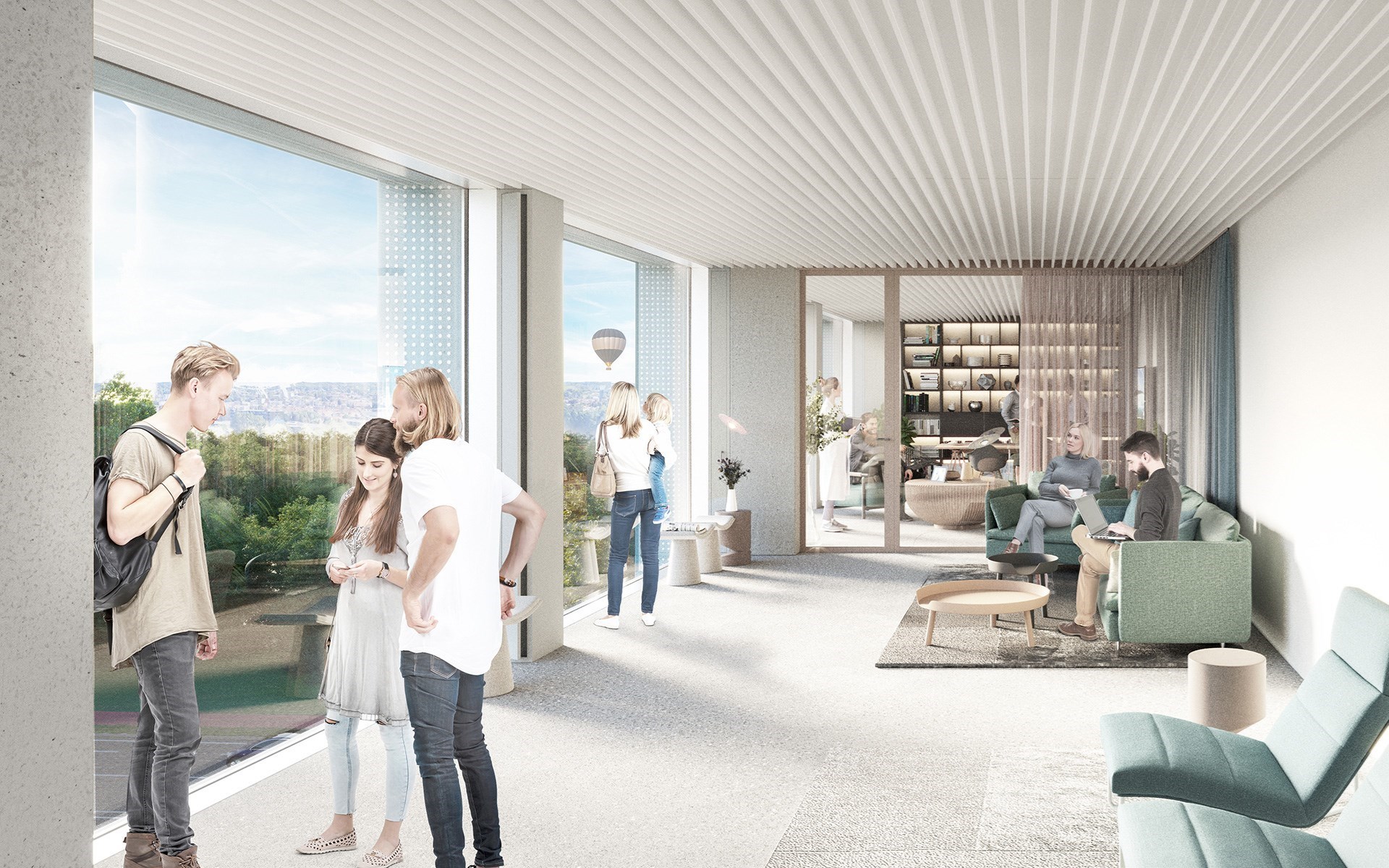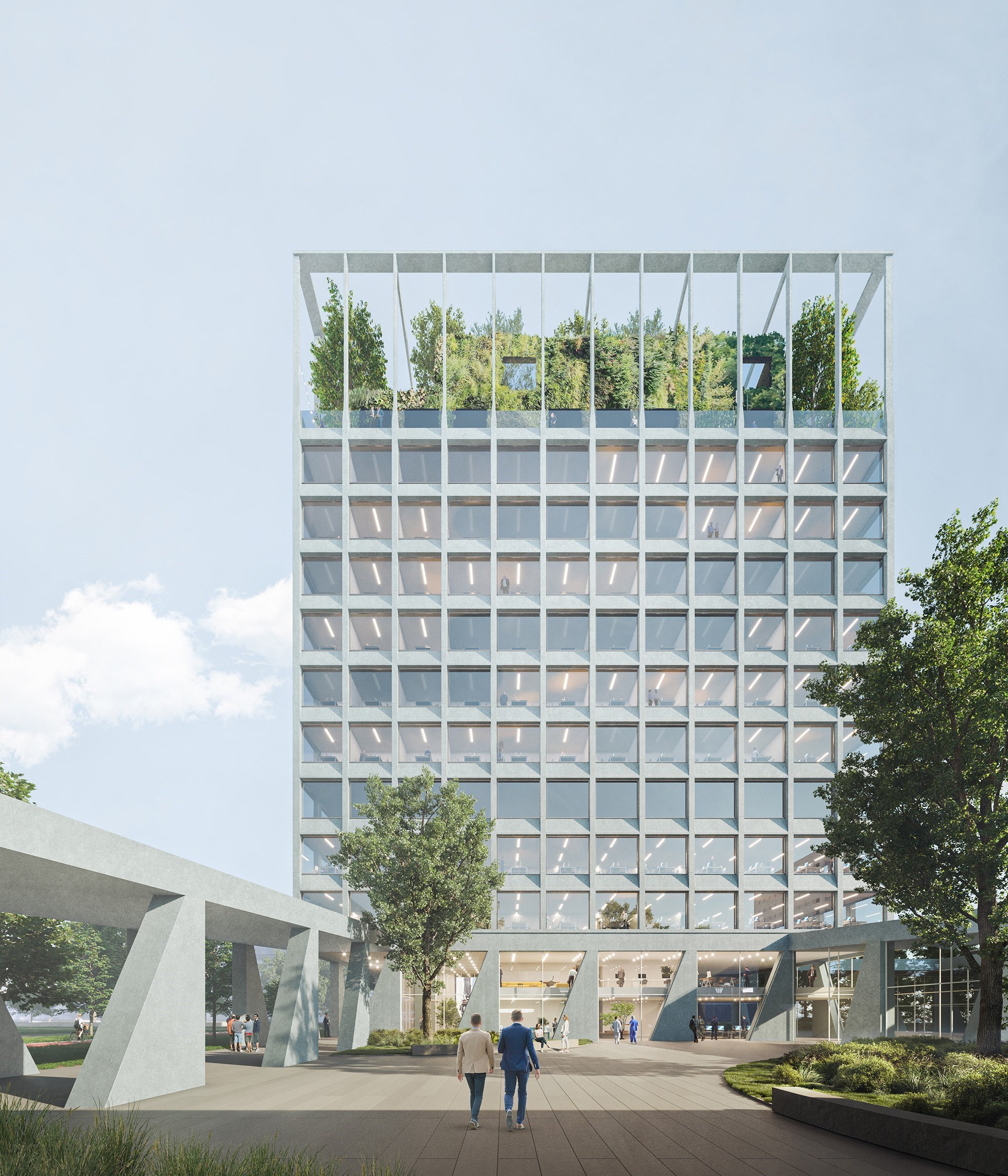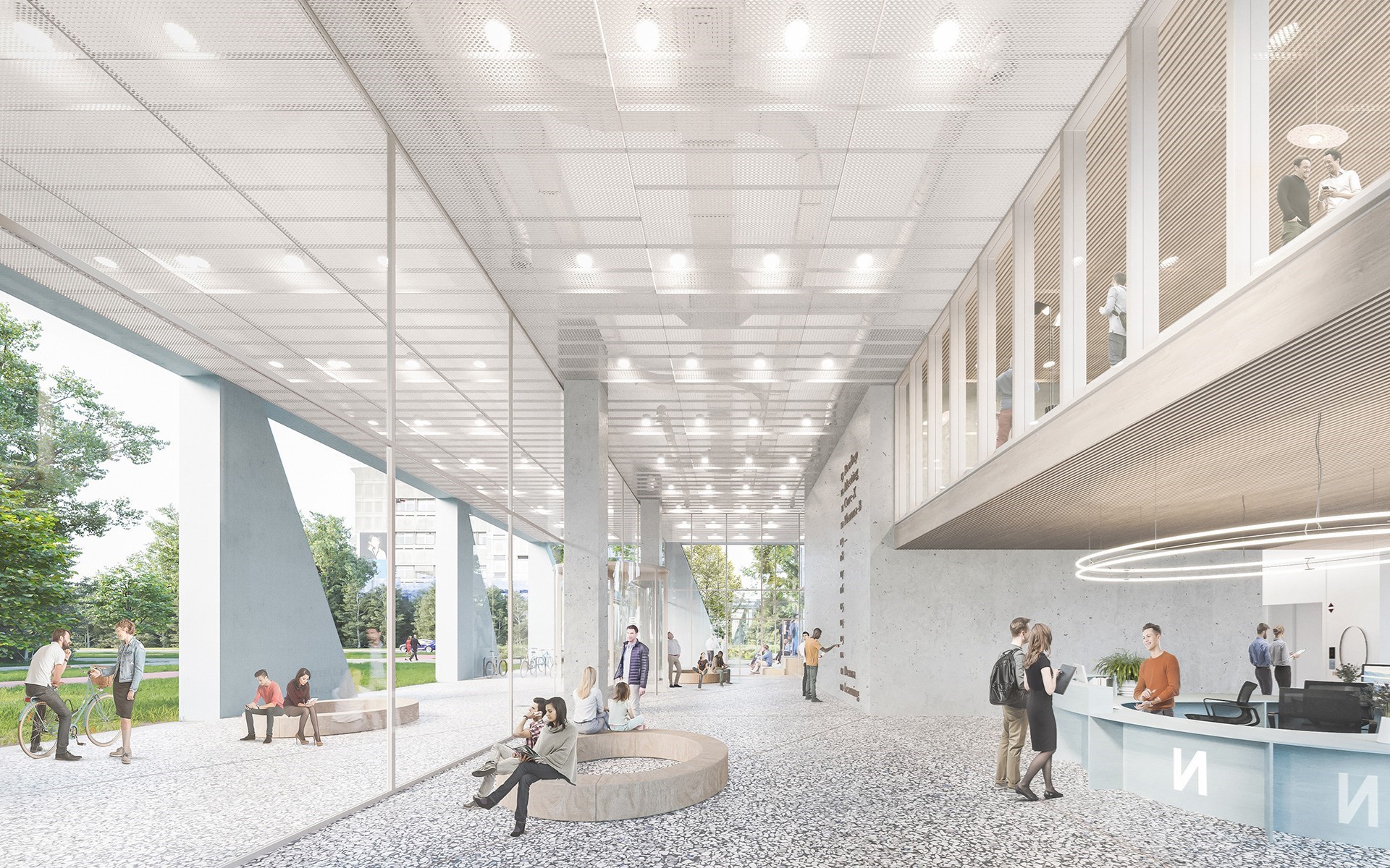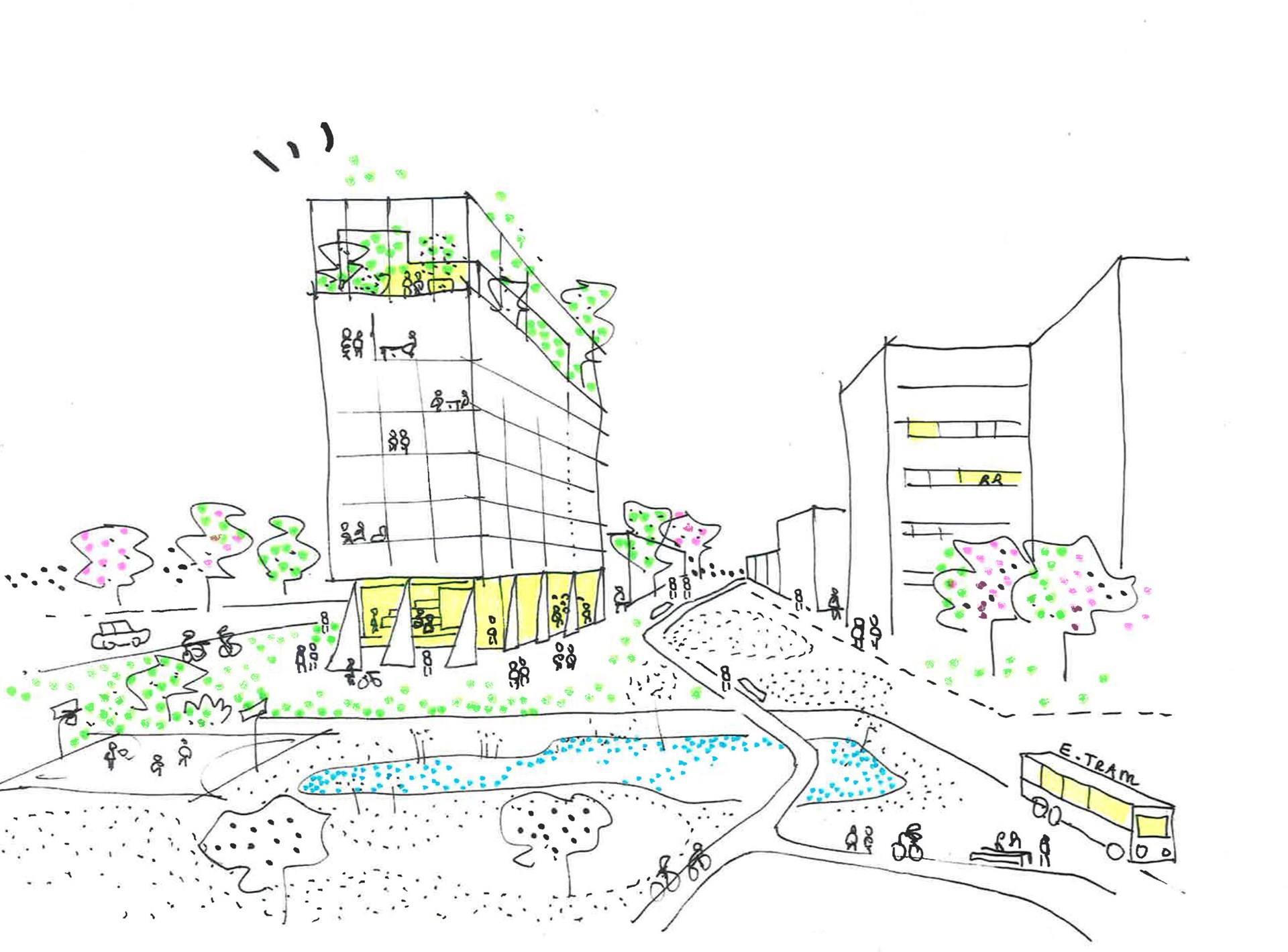 Het nieuwe gebouw wordt uiteindelijk onderdeel van een reeks onderzoeksgebouwen met een aangrenzend park. Een naastgelegen cateringgebouw kan eventueel worden gehandhaafd en op een organische manier in het nieuwe gebouw worden opgenomen. Op de begane grond leiden uitnodigende colonnades en een patio je naar de entree van twee verdiepingen hoog, waar er ook vergaderruimtes zijn ondergebracht. Het dak wordt een tuin vol bomen en planten, met uitzicht naar alle kanten: een opvallende groene kroon, zichtbaar vanaf grote afstand. Hoge raampartijen zorgen binnen voor veel daglicht en bieden gebruikers een maximaal uitzicht over de campus.