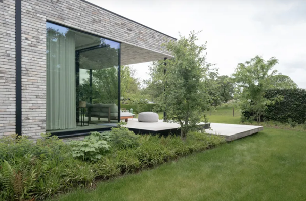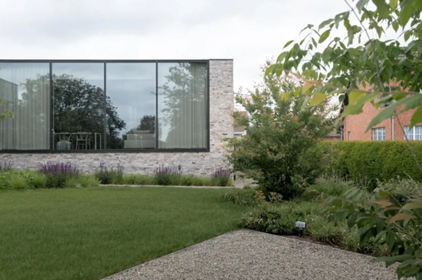 De gevelsteen Nature7 Brick W is de ster van de buitengevel. Haar natuurlijke tinten creƫren een rustig geheel en sluiten perfect aan bij de horizontale lijnen die de architectuur domineren. De lichte kleurschakeringen brengen verfijning en harmonie in de strakheid van het ontwerp. De bakstenen zweven als het ware boven de zwarte sokkel van de garage, terwijl de steen ook in de tuinmuurtjes terugkomt, wat zorgt voor een visuele eenheid.