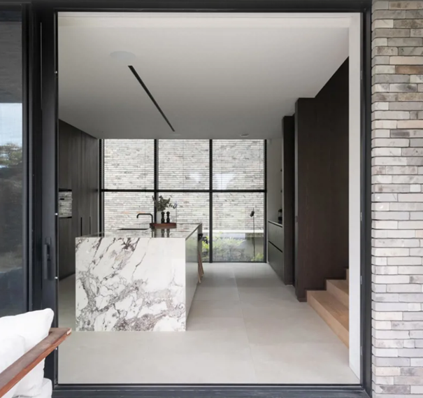 De architectuur speelt met doorzichten. Een bijzonder voorbeeld hiervan is de open keuken, die door grote glaspartijen de gevelsteen opnieuw zichtbaar maakt vanuit het interieur. Dit spel tussen binnen en buiten versterkt het concept van harmonie. Binnen in de keuken zijn de kleuren volledig op elkaar afgestemd. De lichtgrijs-beige schakeringen van de gevelsteen komen terug in het keukeneiland en de maatwerk kasten, vervaardigd door Stef Roets. Het keramische werkblad en de ingetogen kleur van de houten afwerking benadrukken de samenhang en zorgen voor een warme sfeer.