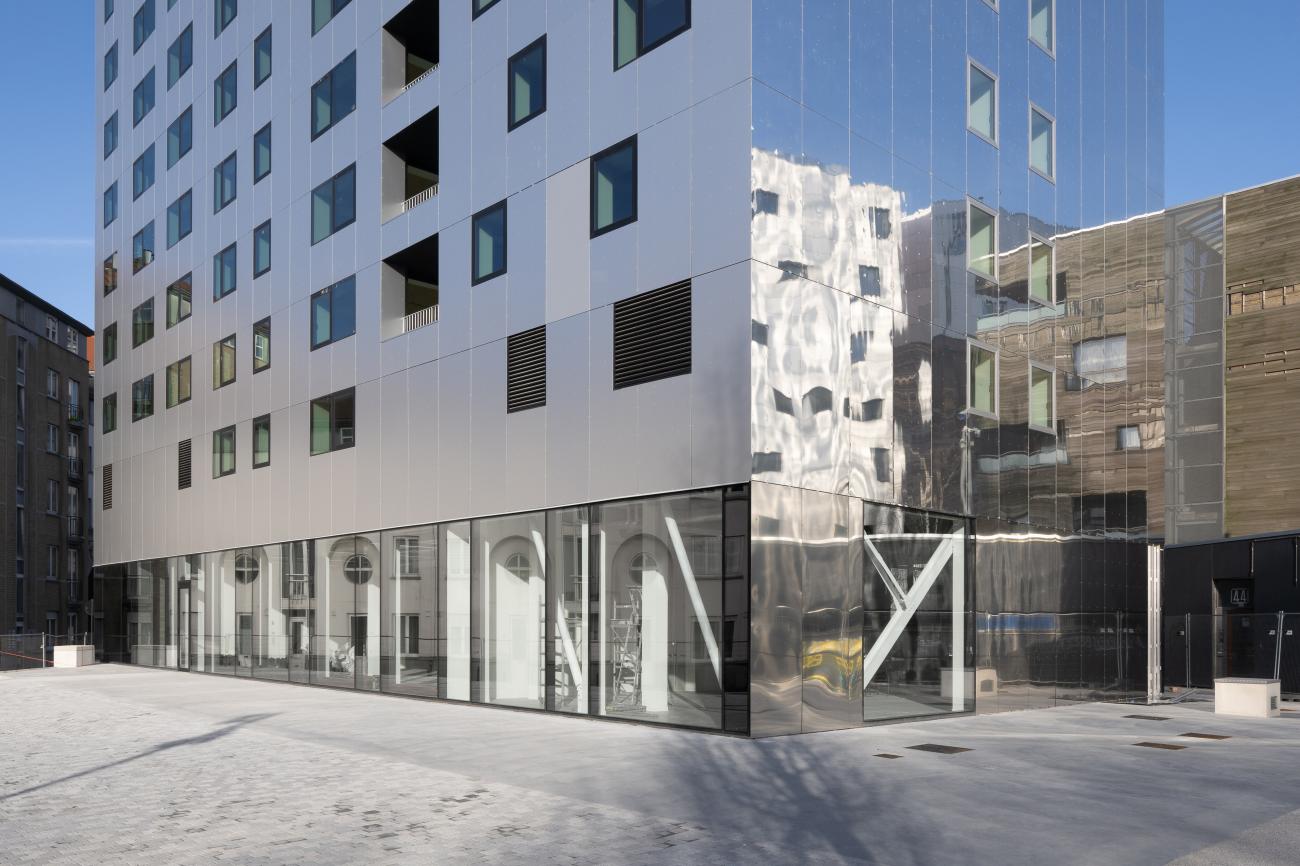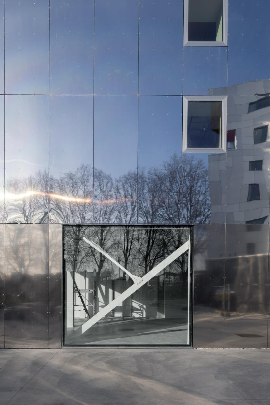 De gevel heeft ook een sobere maar harmonieuze behandeling gekregen. De zuidgevel is voorzien van een aluminium spiegelbekleding, waardoor de toren een nieuwe identiteit krijgt en naadloos opgaat in de stad. Hij weerspiegelt de lucht, wat een erg mooi beeld oplevert op heldere dagen.