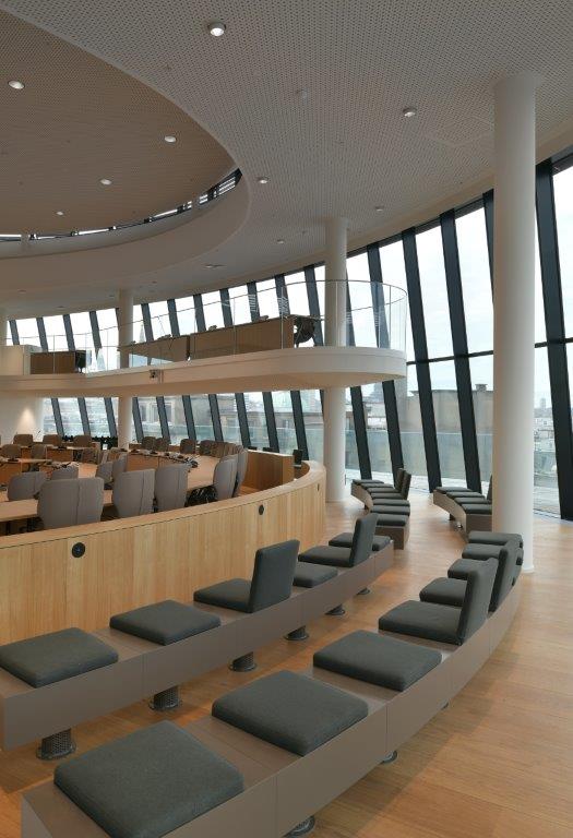 In de loop der jaren zijn er nog enkele ontwerp- en uitvoeringswijzigingen doorgevoerd, conform de veranderende tijdsgeest. “Zo is er ‘en cours de route’ geopteerd voor een transparantere gevel die beter aansluit bij de hedendaagse noden, is al het tropisch hout vervangen door lokale varianten en hebben we er in laatste instantie nog voor gezorgd dat er gebruikgemaakt wordt van riothermie (lees: warmterecuperatie uit afvalwater)”, vertelt Barbara Wolff. “Dit laatste kadert in de algemene focus op duurzaamheid, die uitmondde in een BREEAM Very Good-certificaat. Ook de PV-panelen, performante klimaatplafonds, ledverlichting en het ventilatiesysteem D met warmterecuperatie dragen hiertoe bij. Samen met alle andere betrokken partijen zijn we erg fier op deze markante realisatie!”
