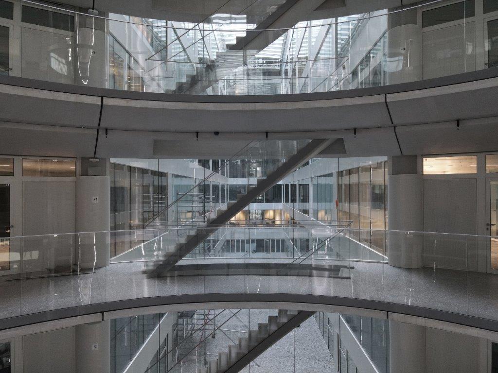 Wat meteen opvalt, is dat de schil van Brucity grotendeels uit glas bestaat en dat het gebouw een erg open karakter heeft. Een bewuste keuze van het ontwerpteam, benadrukt Barbara Wolff, architect-partner bij B2Ai architects. “Ruimtelijkheid, transparantie en connectie zijn de kernwoorden. Gordijngevels met afgeronde hoeken, zonwerende luifels en verdiepingshoge ramen creëren een riante natuurlijke lichtinval en versterken de band met de omgeving, terwijl beglaasde patio’s de onderlinge communicatie tussen de administratieve medewerkers bevorderen, wat voor een efficiëntere werking zorgt. Doordat de hoogte van het gebouw relatief beperkt is, hebben de aanwezige ambtenaren bovendien het gevoel dat ze zich midden in de stad bevinden.”