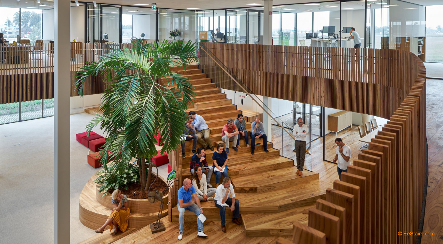 EeStairs ontwerpt, produceert en installeert podiumtrappen. Van openbare gebouwen met veel bezoekers tot grote kantoorruimtes, inclusief het eigen hoofdkantoor. “Podiumtrappen moeten niet alleen beweging tussen verdiepingen bieden, maar ook fungeren als echte aandachtspunten in een ruimte die ook mogelijkheden bieden voor een gesprek”, klinkt het bij EeStairs. “Wij ontwerpen trappen met de specifieke vereisten van de klant in gedachten, van de kleine details en functies tot materialen en vorm van de trap.”