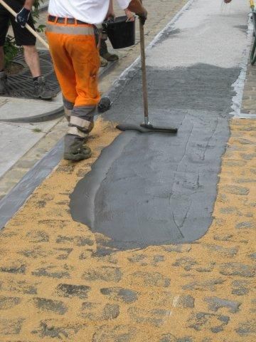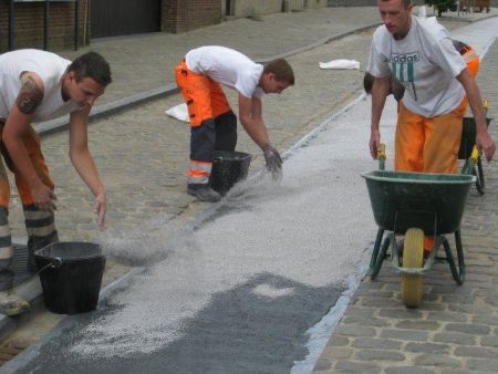 In eerste instantie werden de zijkanten van de rijweg gereinigd en gedeeltelijk uitgevlakt. Dit beperkt opvullen van de kasseivoegen gebeurde met behulp van een snelhardende mortel. Vervolgens werd een oppervlaktecoating met Preco Cryl Kaltplastik 2K grijs aangebracht en ingestrooid met een natuurlijk grijs mineraal met een korrelgrootte van 1 tot 2 millimeter. Door gebruik te maken van deze grote korrels verkrijgt het oppervlak een grote stroefheid. Dit alles maakt dat fietsers zich veel stabieler kunnen verplaatsen en minder hinder ondervinden van de niveauverschillen tussen de kasseien.
