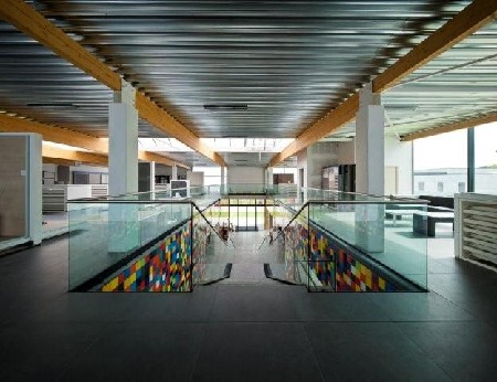 De gevels rondom zijn opgebouwd uit een dambordpatroon van betonpanelen afgewisseld met transparante panelen. De kanaalplaten in de gevel bestaan uit polycarbonaat. Hierdoor valt er veel en diffuus licht in de showroom en de opslagruimte. Dit moet de functionaliteit bevorderen op het vlak van kleurechtheid en energieverbruik. Daarnaast werd aandacht besteed aan de beperking van energieverbruik door een studie uit te voeren naar geschikte types lampen, de posities van de lampen en automatische schakelaars met lichtsensor.