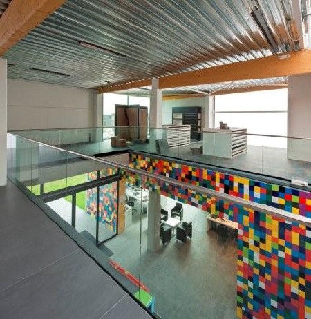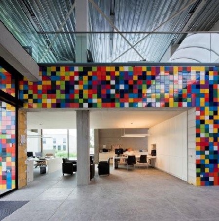 Een open inkomhal verbindt de westzijde met de oostzijde van het gebouw. De opvallende inkomhal is afgewerkt met 9000 tegels in 14 verschillende kleuren. De 9.000 tegels zijn bewust patroonloos ontworpen met een eenvoudig digitaal rekenblad. Het geheel refereert naar een groot kunstproject van Gerhard Richter getiteld ‘4900 colours’.