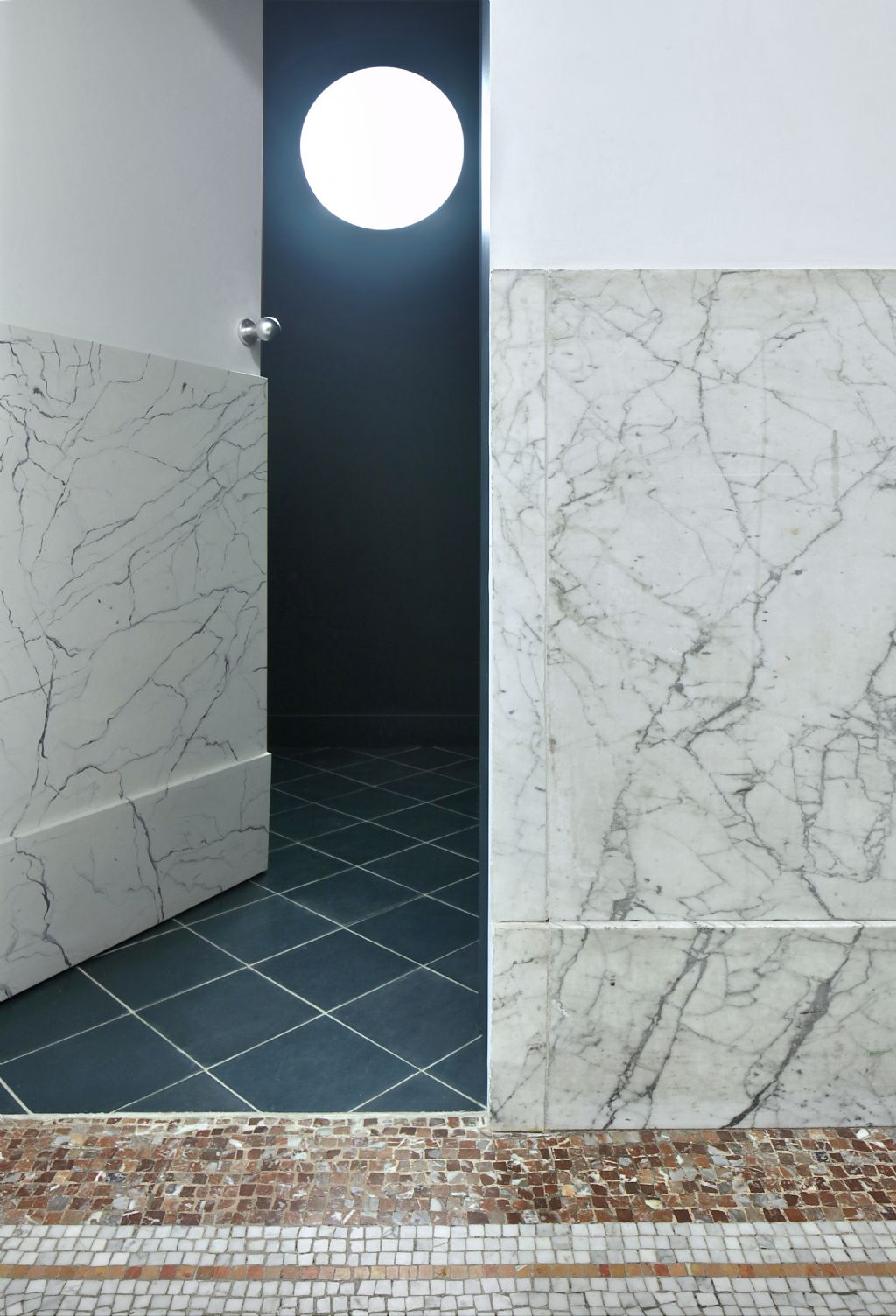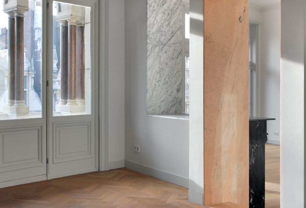 Er werd geopteerd voor een formele strategie die net als de gevel eclectisch en accumulatief is. Kamer na kamer definiëren de ontwerpers de potenties en de noodzakelijkheden die horen bij de herinrichting tot appartementen.