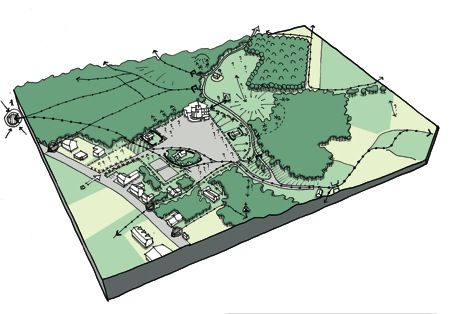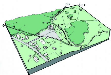 Er werd gewerkt met zichtassen en ontmoetingsplaatsen, waarbij de belangrijkste elementen een overdekte ontmoetingsplaats (de voormalige boskanterswoning die enkel als een ‘schil’ behouden werd), een amfitheater (in de kom gevormd door de restanten van het oude zwembad) en een speelheuvel met asvormige glijbanen waren, naast enkele zitelementen die over het gebied ‘gestrooid’ werden.