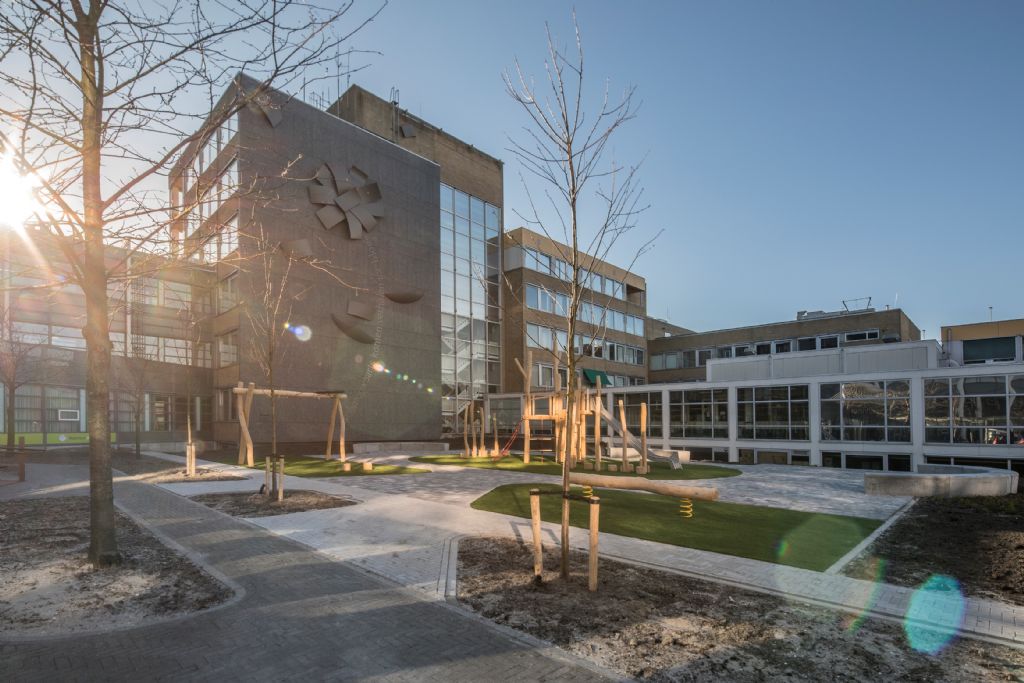 Architectenbureau de Jong Gortemaker Algra had echter eerst een groene gevel met klimplanten in gedachten. Gezien dat budgettair en naar onderhoud geen haalbare optie was, is men op zoek gegaan naar de combinatie van gevelplaten met een vriendelijk en toch levendig karakter.
