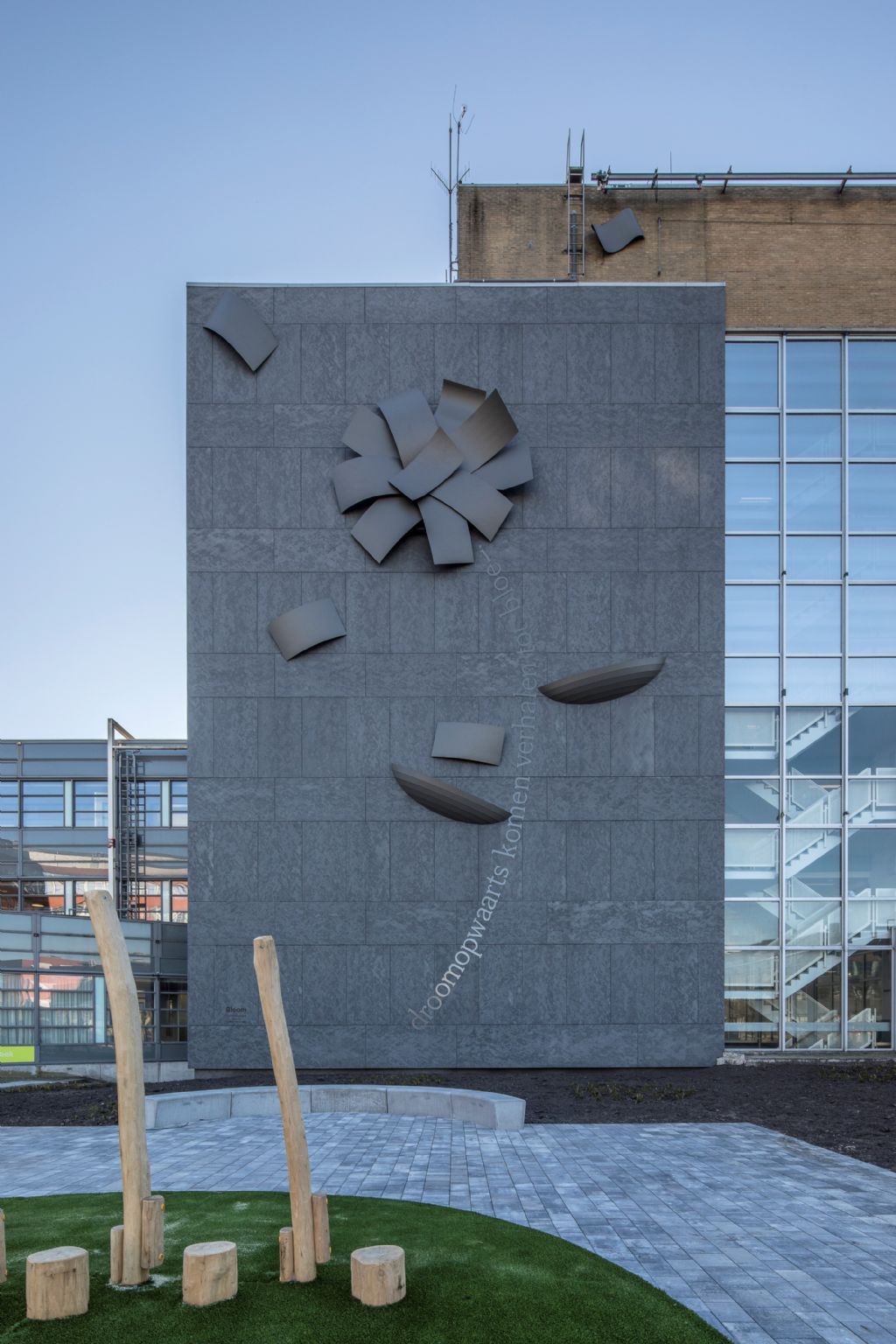 In dit beeld is er gespeeld met de boot en de bloem en deze zijn als het ware getransformeerd. De tekst “ droomopwaarts komen verhalen tot bloei”, door Merel Morre is als het ware complementair aan deze gedachte. Het kunstwerk en de gevelplaten zelf zijn daarnaast ook demonteerbaar waarbij het opnieuw kan worden opgebouwd wanneer het gebouw wordt gesloopt.