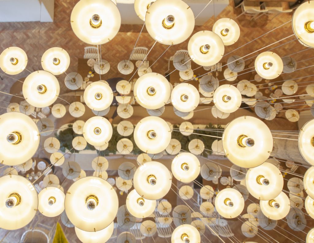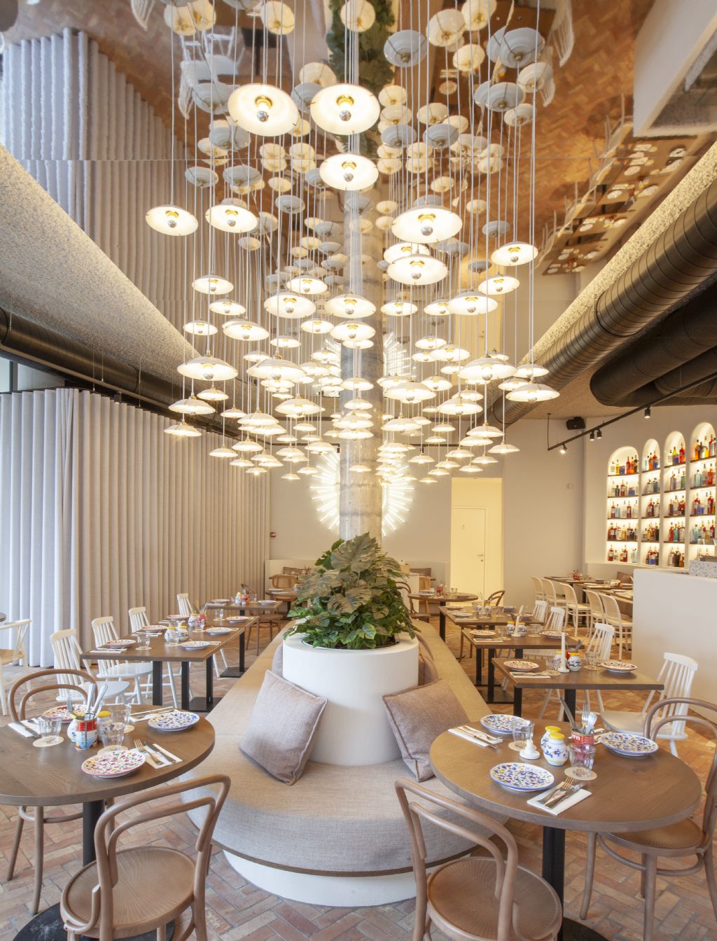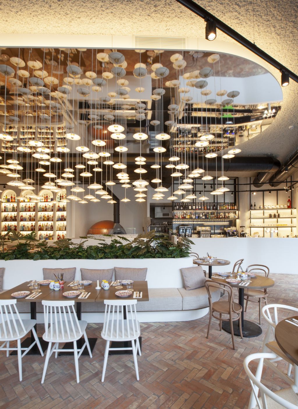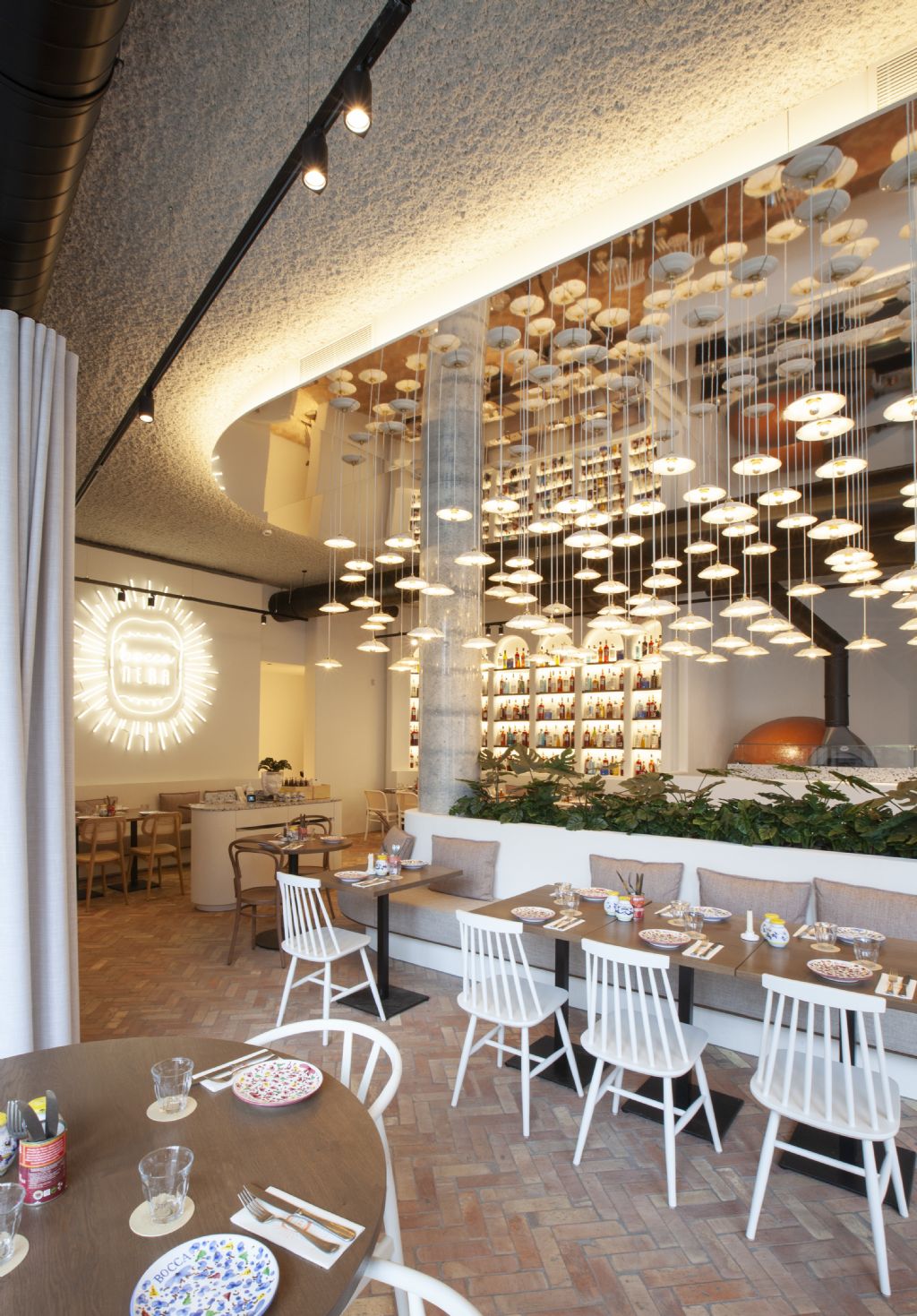 De centrale zitbank met plantenbak en een overdaad aan pendelende verlichting vormen een mooi tafereel in de ruimte. Ook de traditionele pizzaoven en overweldigende flessenwand zijn vanuit elke plek voelbaar en aanwezig. De neonverlichting van het logo vormt de blikvanger van de ruimte en symboliseert, als centraal lichtelement, de zon.