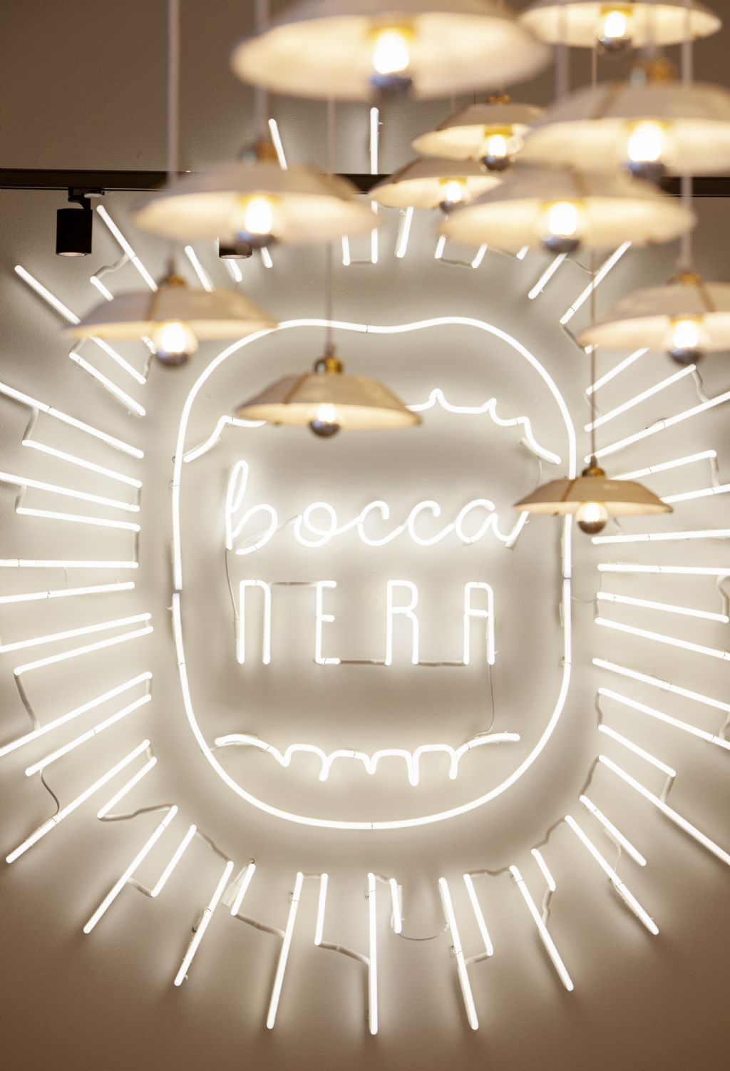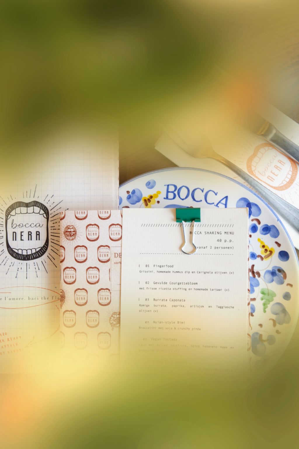 De puurheid en eenvoud van het interieur stellen zich onderdanig op ten opzichte van de geserveerde gerechten. Bocca Nera is een totaalconcept van het interieur tot het grafische design en het drukwerk; elk visueel aspect vult het ander aan.