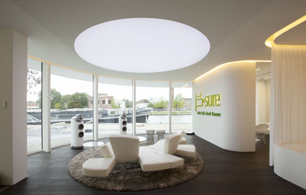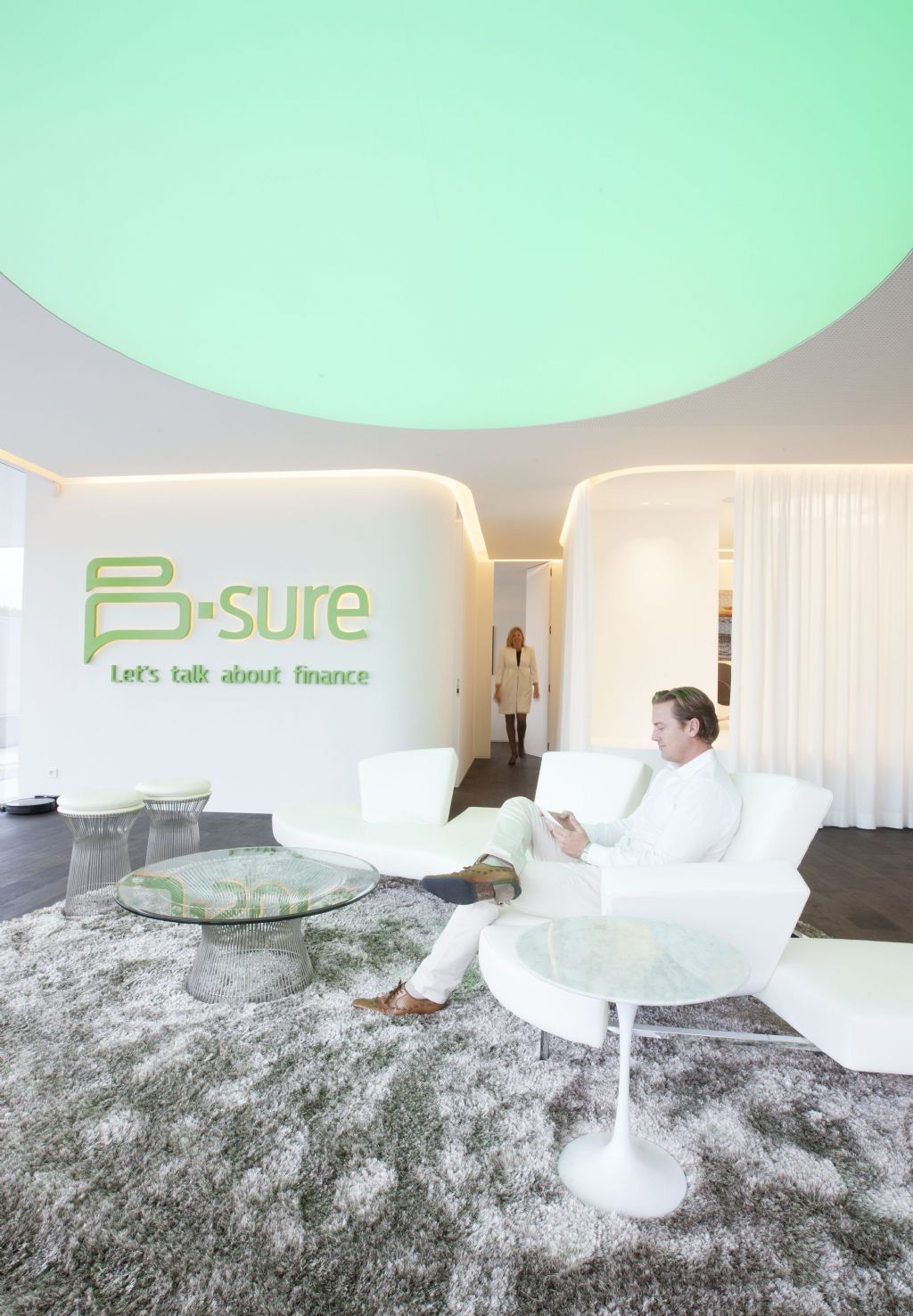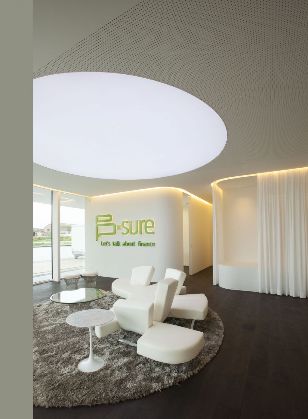 De financiële dienstverlener B-Sure koos een unieke locatie voor zijn kantoren: aan de Hasseltse Blauwe Boulevard. UAU Collectiv liet zich dan ook inspireren op het bootthema voor de inrichting van de kantoren. In hetzelfde gebouw zetelt ook de tweede vestiging van Merit Capital, een onafhankelijke beursvennootschap. Romulus & Remus zorgde voor op maat gemaakte meubelen.