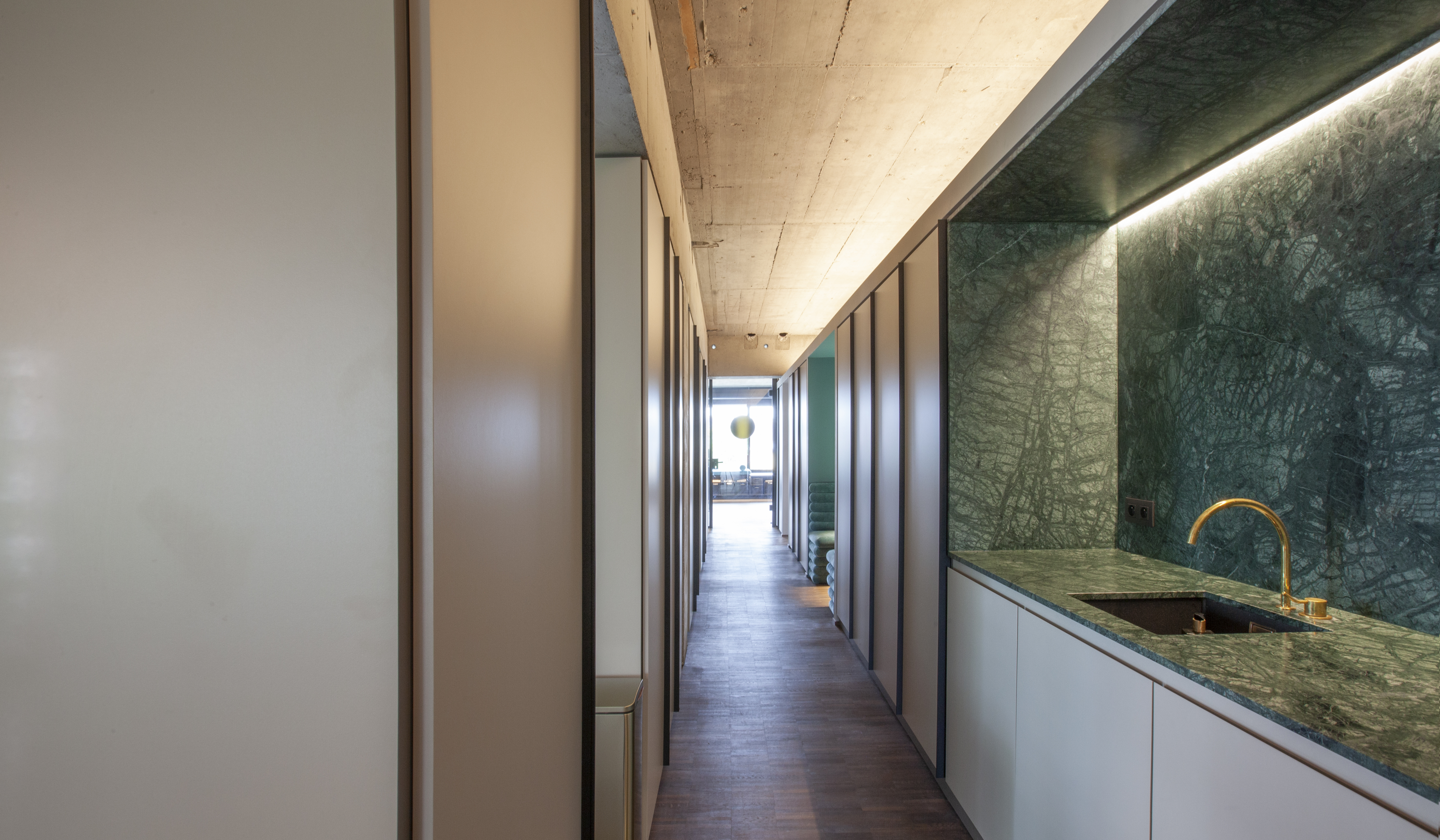 De kantoorgebouwen net buiten het centrum van Hasselt werden in de jaren 70 opgetrokken in een structuur van betonnen balken en kolommen ingevuld met niet-dragende wandelementen. Dit constructief principe verleent de gebouwen een strakke, sobere en evenwichtige uitstraling. Het uitgebalanceerd architecturaal concept leent zich anno 2019 perfect om een kantoor in te richten naar de hedendaagse normen. De kenmerkende constructiewijze werd opnieuw blootgelegd en ook het ontwerp is gebaseerd op een eerlijkheid van materiaalgebruik. De open planvorm met een overvloed aan daglichttoetreding gaf aanleiding tot een eenvoudig concept. De centraal gelegen circulatiekern is de locatie waar het meeste overleg plaatsvindt en hoe verder men zich hiervan distantieert, hoe meer rust er heerst. Op de koppen van het plateau bevinden zich dan ook de landschapskantoren. De ruimte tussenin kan ingezet worden voor divers overleg. Onder de betonnen balkstructuur zorgt de plaatsing van open rekken voor een opdeling van de grote midden-zone in een overlegzone en circulatiezone.