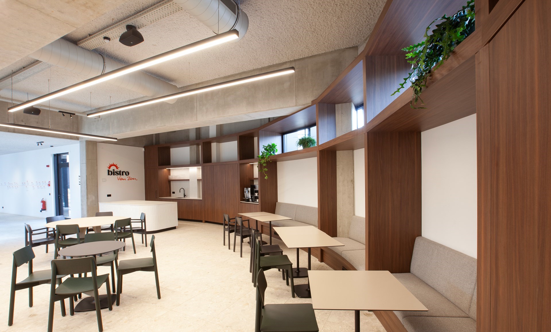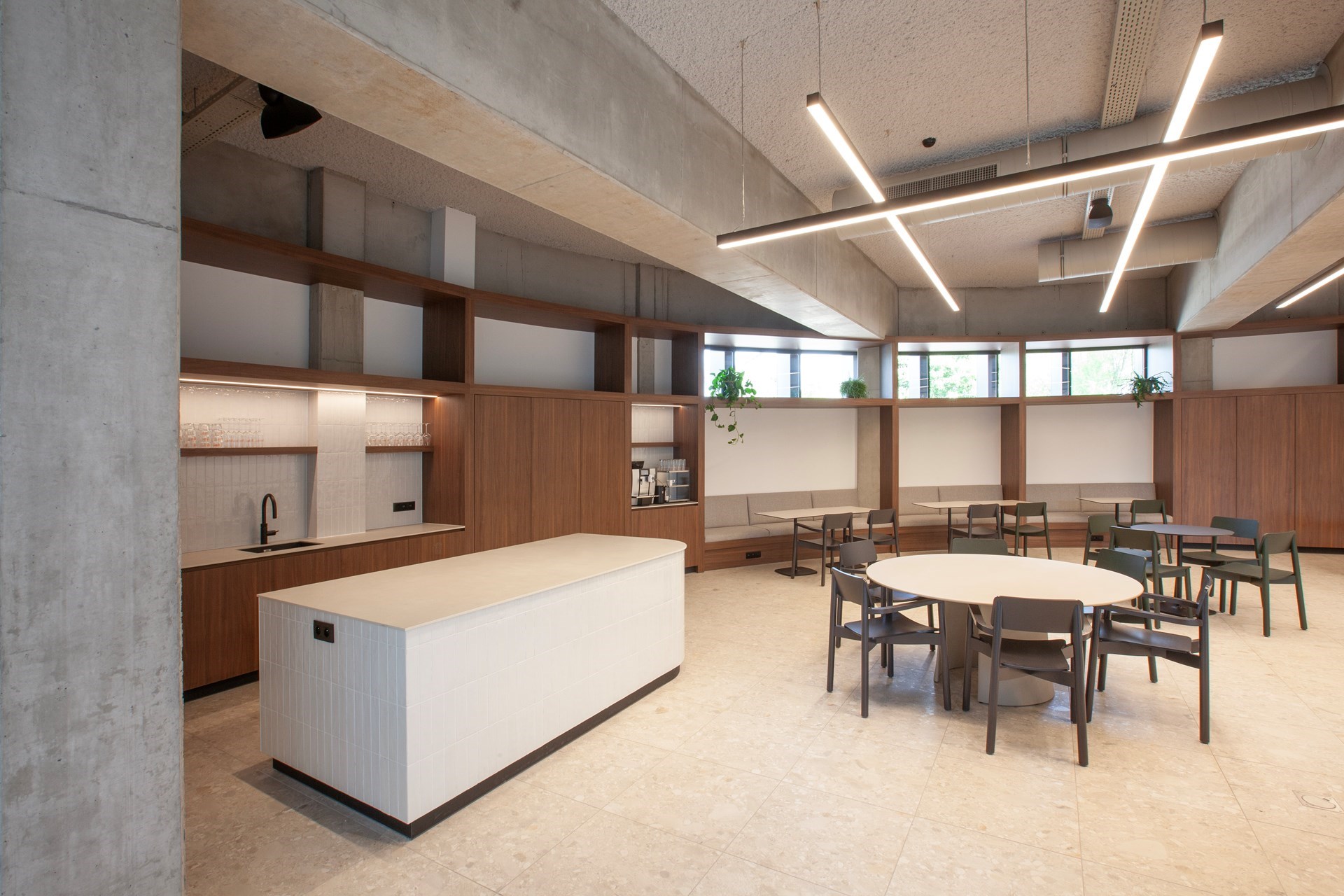 Aan de draagstructuur van het bestaande gebouw werd niks veranderd. “Meer nog”, vertelt Pignanelli, “De betonnen kolommen waren ingepakt met vliesbehang. Die hebben we eraf gehaald, en de kolommen mooi gereinigd zodat het beton terug zichtbaar is.” Behalve de betonnen structuur zijn ook de technieken zichtbaar en leesbaar gemaakt. Daartegenover staat dat het akoestisch pleisterwerk is uitgevoerd in een zeer licht en zacht, aardetoon grijs, een kleur die amper opvalt.