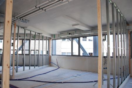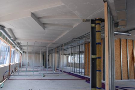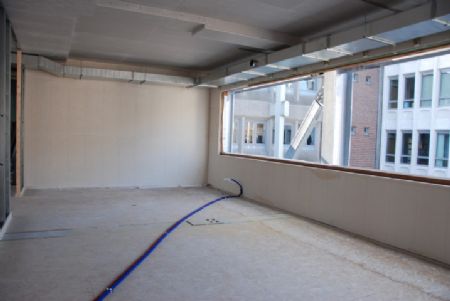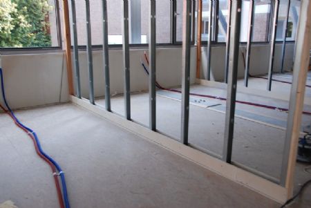Aan de beide zijden van de Metal Stud-binnenwanden wordt voor het aanbrengen van de chape een strook PROMATECT-100 aangebracht. Deze garandeert de brandwerende afdichting onder de wand.