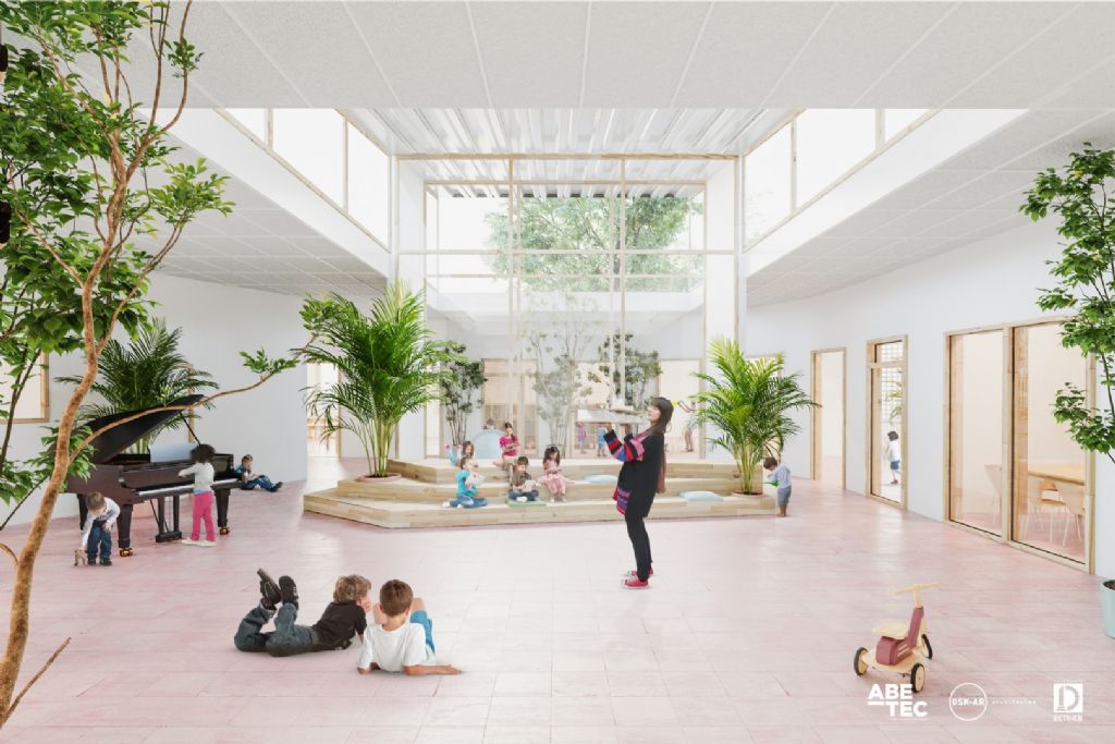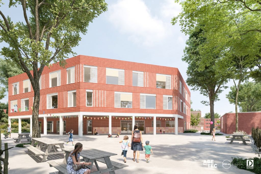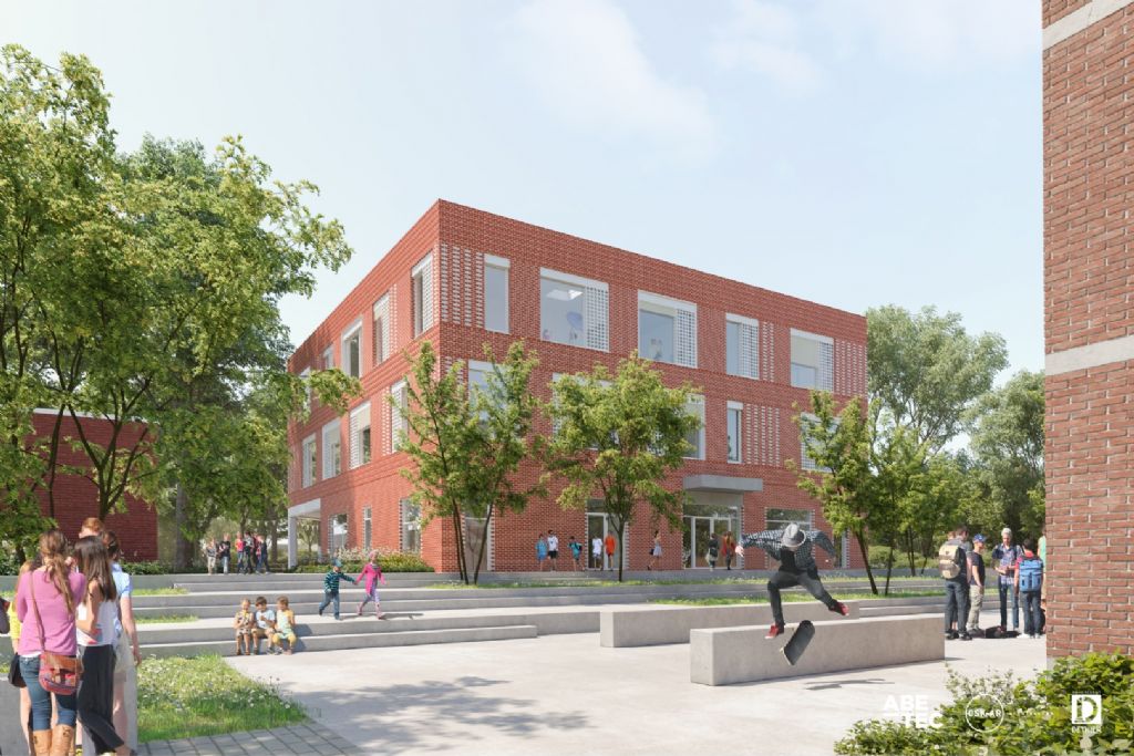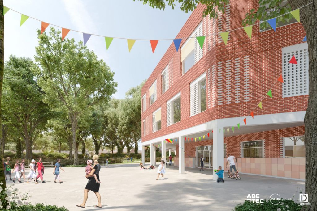 De speelplaats wordt volledig heraangelegd met een focus op groen en de bestaande sportzaal wordt uitgebreid met nieuwe kleedkamers en een sportberging.