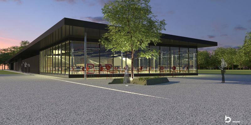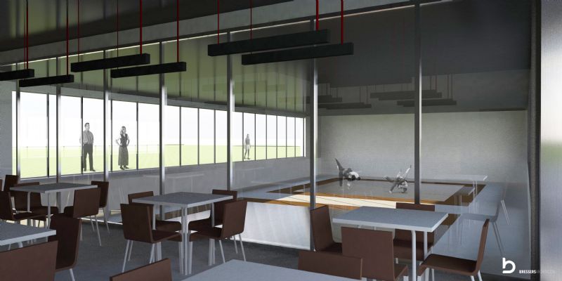 Op de kop van het gebouw wordt een uitnodigend cafetaria gebouwd. Deze cafetaria met zicht rondom bevindt zich in het epicentrum van de sportsite.