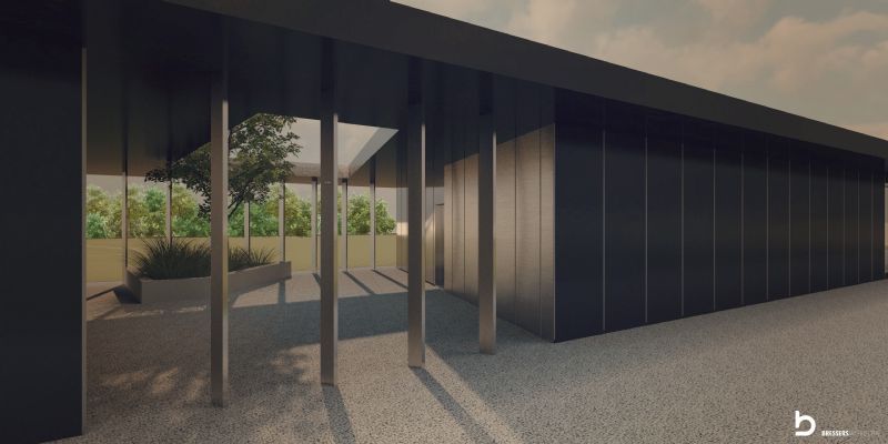 Het gebouw is modulair opgevat en bestaat uit een vaste ritmering van 120cm, dit in functie van de gevelafwerking en deuropeningen. Door gebruik te maken van aluminium gevelafwerking, wordt een onderhoudsvriendelijk, duurzaam en modern gerealiseerd.