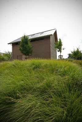 Het maaiveld ligt ongeveer 1 meter hoger als de straat. Precies dit laatste vormde het uitgangspunt om het gebouw op te richten op een sokkel, ingegraven in de grond, met daarop een eenvoudig rechthoekig volume voorzien van een zadeldak. Het gebouw weet zich op deze manier perfect te integreren binnen de landelijke architectuur uit de omgeving.