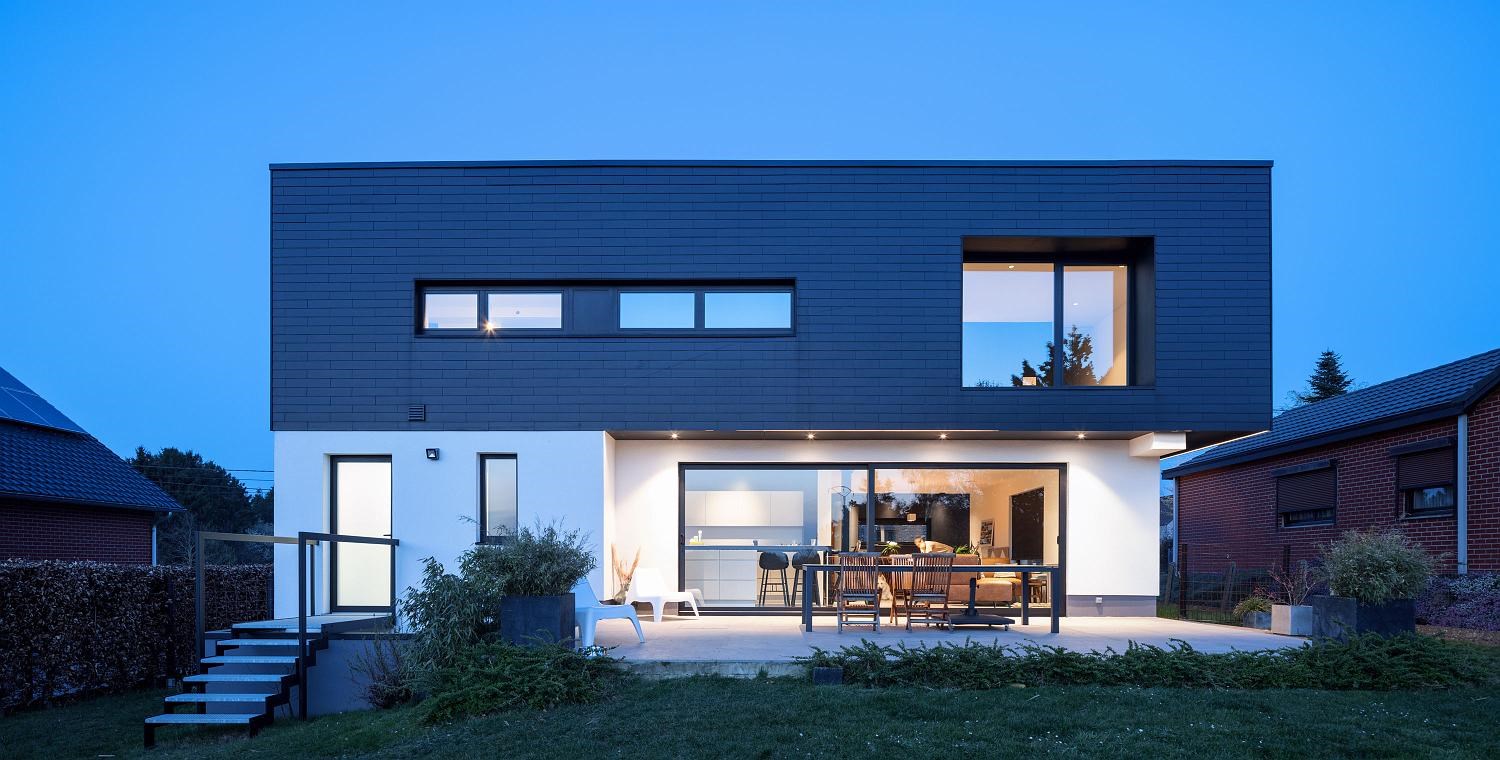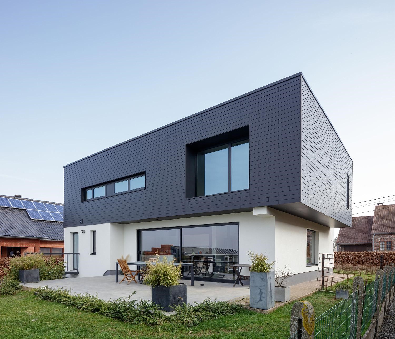Architecte Géraldine Gosse verbouwde een huis uit 1969, gelegen in een woonwijk in Suarlée (vlak bij Namen), om te kunnen leven en werken in een ruimere, hedendaagse woon- en kantooromgeving. De gevelbekleding in zwarte Alterna leien contrasteert mooi met de witte sokkel en draagt zo op een elegante manier bij tot de eigentijdse uitstraling van het geheel.