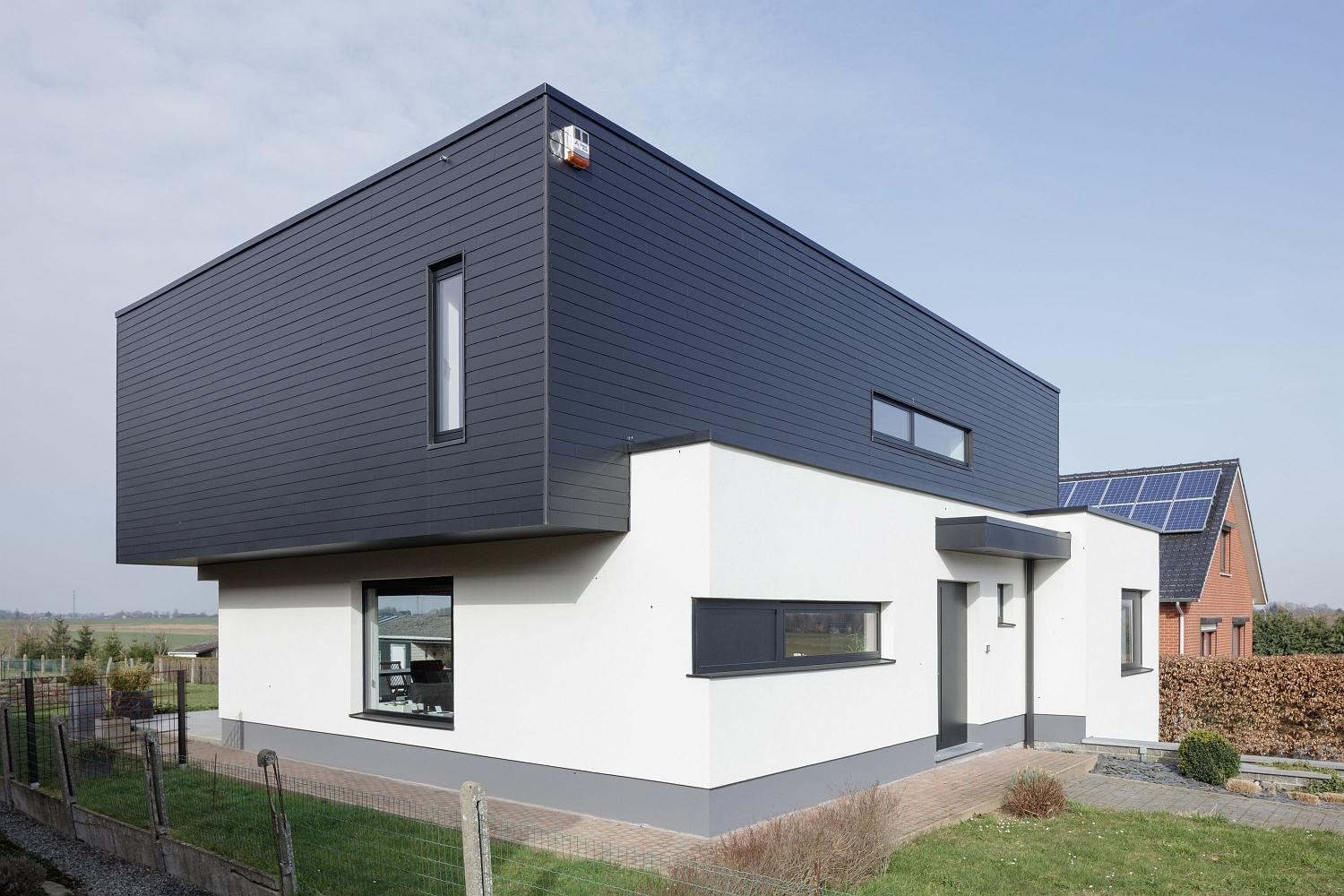Om de dragende muren, die uit argexbetonblokken bestaan, niet te overbelasten, moest de structuur van de uitbreiding zo licht mogelijk zijn. Vandaar de keuze voor houtskeletbouw. Qua gevelbekleding is er geopteerd voor Cedral Alterna vezelcementleien (60 x 32 cm), zowel vanwege hun lichte gewicht als hun hedendaagse uiterlijk. Ze zijn in halfsteensverband geplaatst, waardoor de leihaken helemaal aan het zicht onttrokken zijn. De eigenaars moesten de plaatselijke stedenbouwkundige dienst overtuigen van deze keuze, maar het feit dat de rest van de woonwijk al volledig klaar was, vergemakkelijkte de zaak, vermits de voorschriften niet langer verplicht waren.