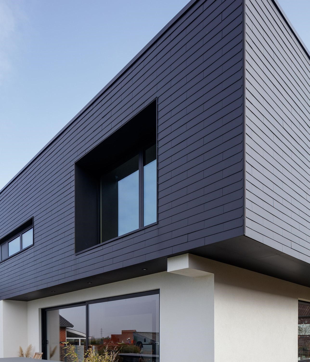 Om dat uitgepuurde effect nog te versterken, besteedde de architecte ook veel aandacht aan de integratie van de dakgoten en regenpijpen. Bovendien maken de meeste ramen haast integraal deel uit van de gevelbekleding, behalve in de achtergevel, waar ze omzoomd worden door een slank antracietkleurig zinkkader. Enkel het raam van de ouderlijke slaapkamer beschikt over een breder kader in klassiek zwartgelakt aluminium om oververhitting te vermijden.