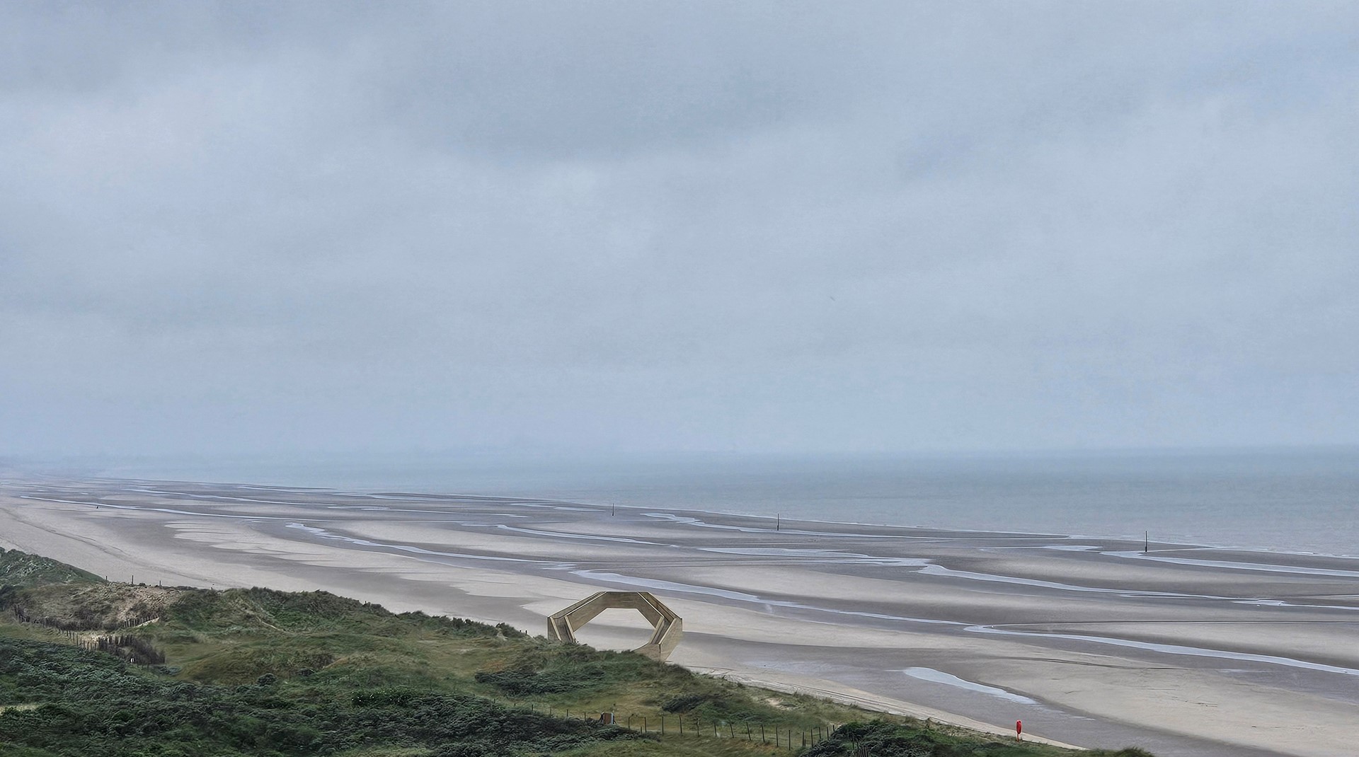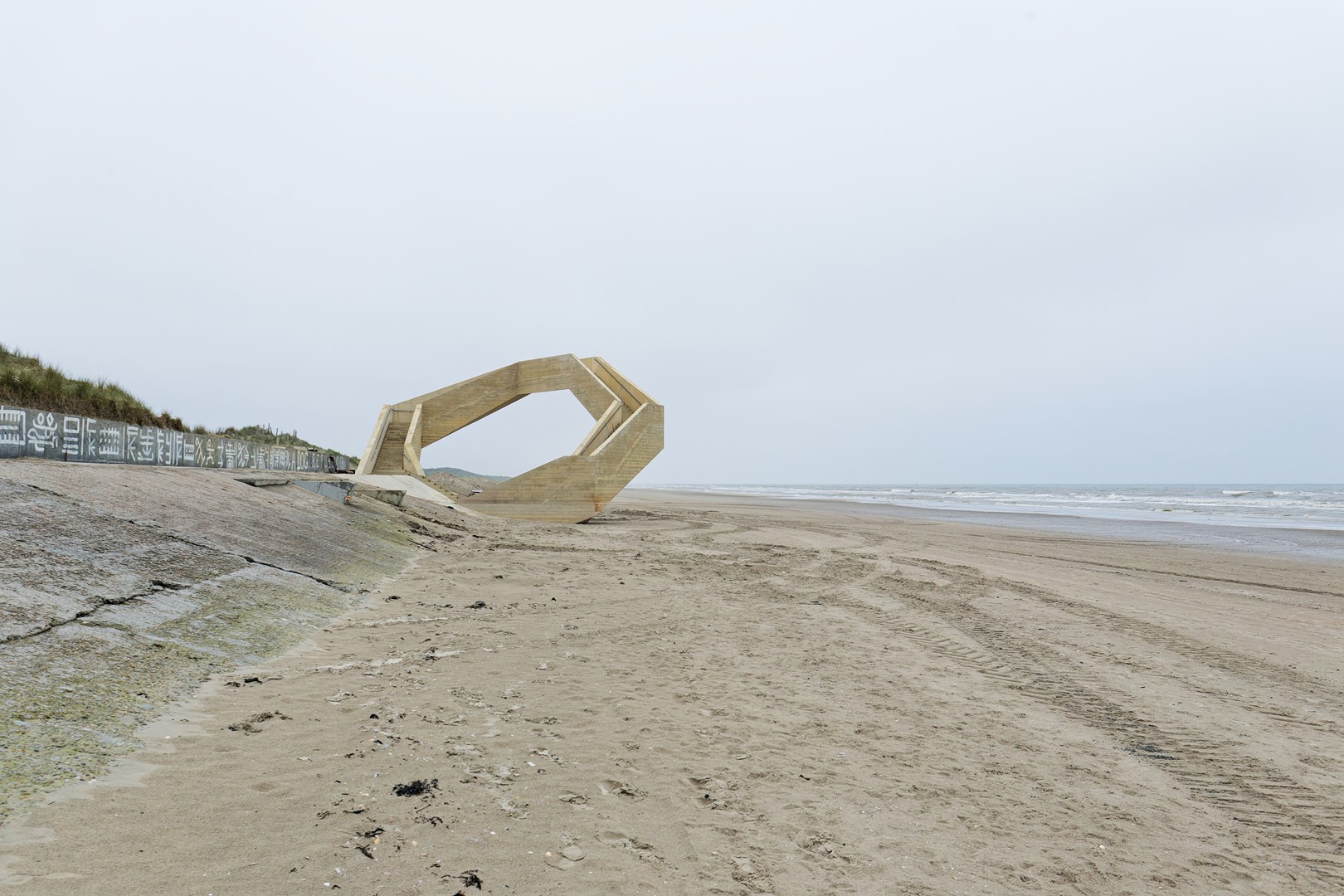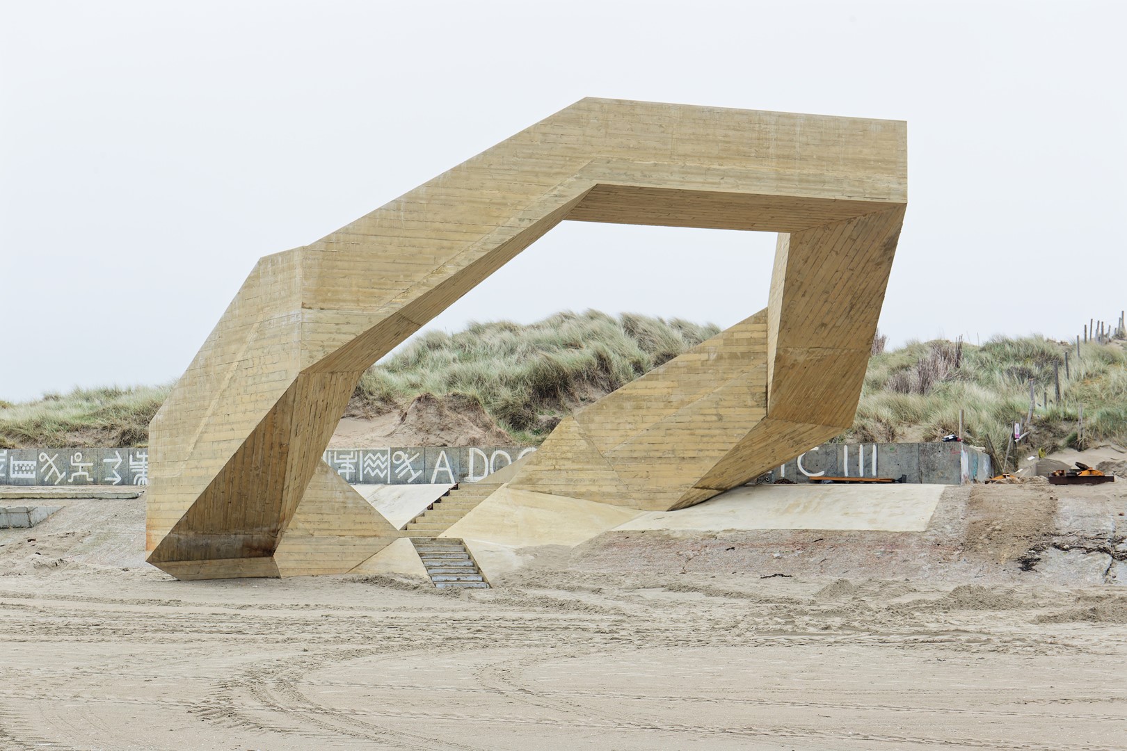 Gemaakt van beton, past de constructie qua textuur en kleur perfect bij de omgeving en is bestand tegen het agressieve zeeklimaat. Beton vereist weinig onderhoud en integreert naadloos met de betonnen promenade. De robuuste constructie kan zelfstandig blijven staan, zelfs als de duinen zich eromheen uitbreiden.