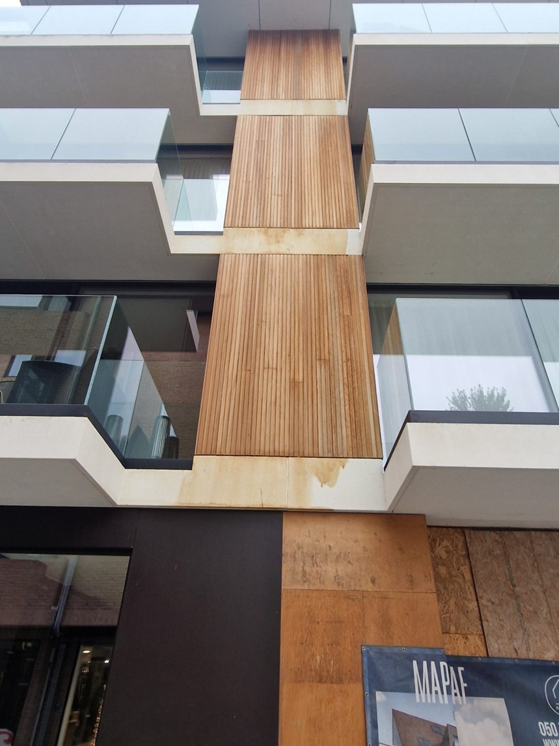 Recent stuitte een verontruste aannemer op een opvallende casus. De gevelbekleding bestond uit geribbelde planken van thermisch gemodificeerd ayous, die na montage brandvertragend waren behandeld om te voldoen aan brandreactieklasse B. Op papier was aangetoond dat de toegepaste brandvertragers niet zouden uitlogen.