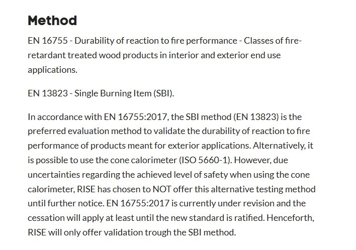 Een duidelijk voorbeeld is te vinden op de website van het Zweeds Staatsonderzoeksinstituut RISE, waar expliciet wordt vermeld dat de ISO 5660-1 niet langer wordt geaccepteerd als bewijs voor de duurzaamheid van brandvertragende behandelingen. Hierboven is een screenshot te zien van hun website die dit bevestigt.