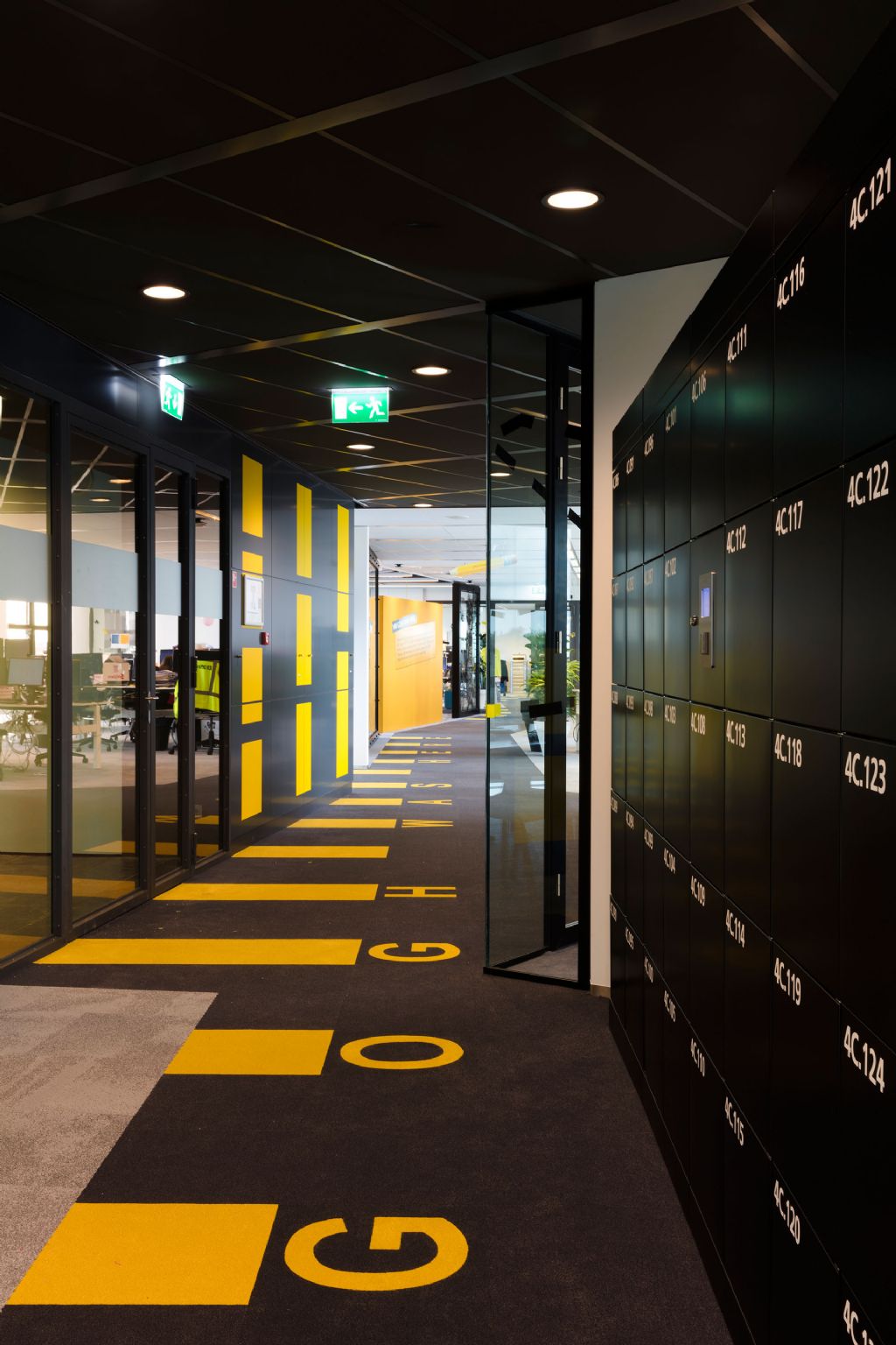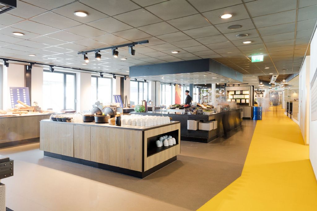 Om een eenduidige uitstraling te behouden moesten ook de plafonds in diverse varianten uitgevoerd worden. In het grootste gedeelte van het kantoor (8.000 m2) is OWA Sinfonia in stroken uitgevoerd in een verdekt uitneembaar bandrastersysteem.