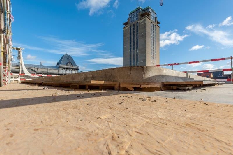Uniek is dat deze nieuwe betonlaag slechts vijf centimeter dik mag zijn voor de gevels van de laagbouw en zes centimeter voor de gevels van de toren. Een gevolg van de wil om het historische architecturale concept te behouden – de arduinen sokkels van het gebouw worden bijvoorbeeld niet verplaatst en moeten na de renovatiewerken nog steeds onder de betonnen gevelbekleding uitsteken. “Dit bezorgt ons heel wat kopzorgen”, glimlacht Sam Verhoogen. “Het bestuur legt immers ook uiterst strenge esthetische eisen op, terwijl het aartsmoeilijk is om zo'n dunne betonlaag zonder oppervlaktefouten te ontkisten. Om hem zo vloeibaar (en dus verwerkbaar) mogelijk te krijgen, leunt het beton immers aan tegen de grenzen van ontmenging. Hoe dikker de betonlaag, hoe makkelijker het is om aan die kwaliteitseisen te voldoen (zoals ook blijkt uit de gevelstorten die we ter plaatsen hebben uitgevoerd). Maar met een maximumdikte van slechts vijf centimeter is dat erg delicaat. We kunnen ook nergens terecht voor goede raad, want het is de eerste keer dat een aangestorte betonlaag zo dun zal zijn. Het is met andere woorden continu zoeken naar de juiste betonsamenstelling en uitvoeringsprocedure. We werken samen met verschillende betontechnologen om dit klaar te spelen. Al bij al zullen de resterende gevelrestauratiewerken nog goed twee jaar in beslag nemen.”