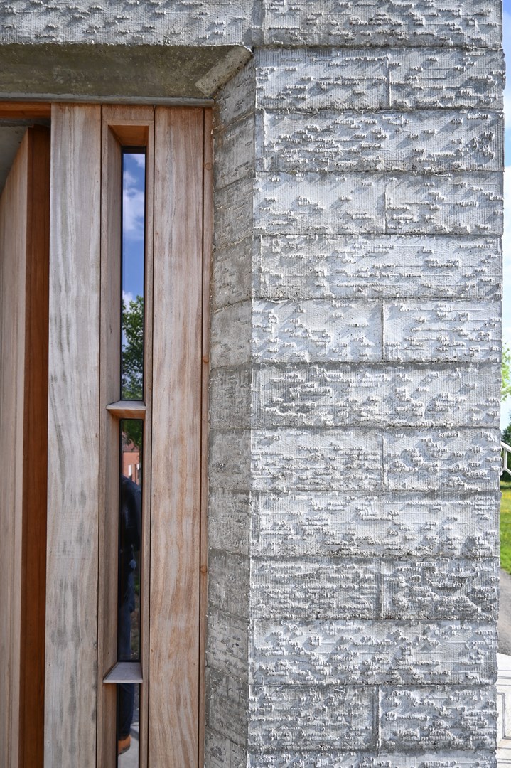 “Het begon als een thesisproject bij het R[x]D-team van de KU Leuven, vanwege onze gedeelde interesse om de overlap tussen architectuur en robotica te verkennen. Terwijl robotica doorgaans focust op het creëren van identieke resultaten, zochten wij naar een manier om het proces te verrijken met creativiteit, onvoorspelbaarheid en menselijke imperfecties, zodat robot en ontwerper elkaar kunnen versterken. Via talloze experimenten kwamen we uit bij het ontwerpen van unieke betontexturen. Na een interessante casestudy bij DMOA Architecten kregen we de kans om het effectief in de praktijk toe te passen bij de realisatie van de Sint-AnnakapelBelangrijk hierbij zijn de miljoenen willekeurige, maar gecontroleerde scheurtjes die ontstonden bij het robotisch bewerken van het karton. Het juiste gehalte aan imperfecties brengt een bepaalde spanning en menselijkheid in het geheel, wat doorgaans niet gerelateerd wordt met robotica. Daarnaast prijken er tevens handgegraveerde tekeningen op de gevel, als tatoeages die meer vertellen over de rijke geschiedenis van het pand.”