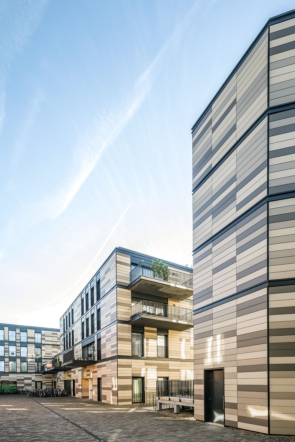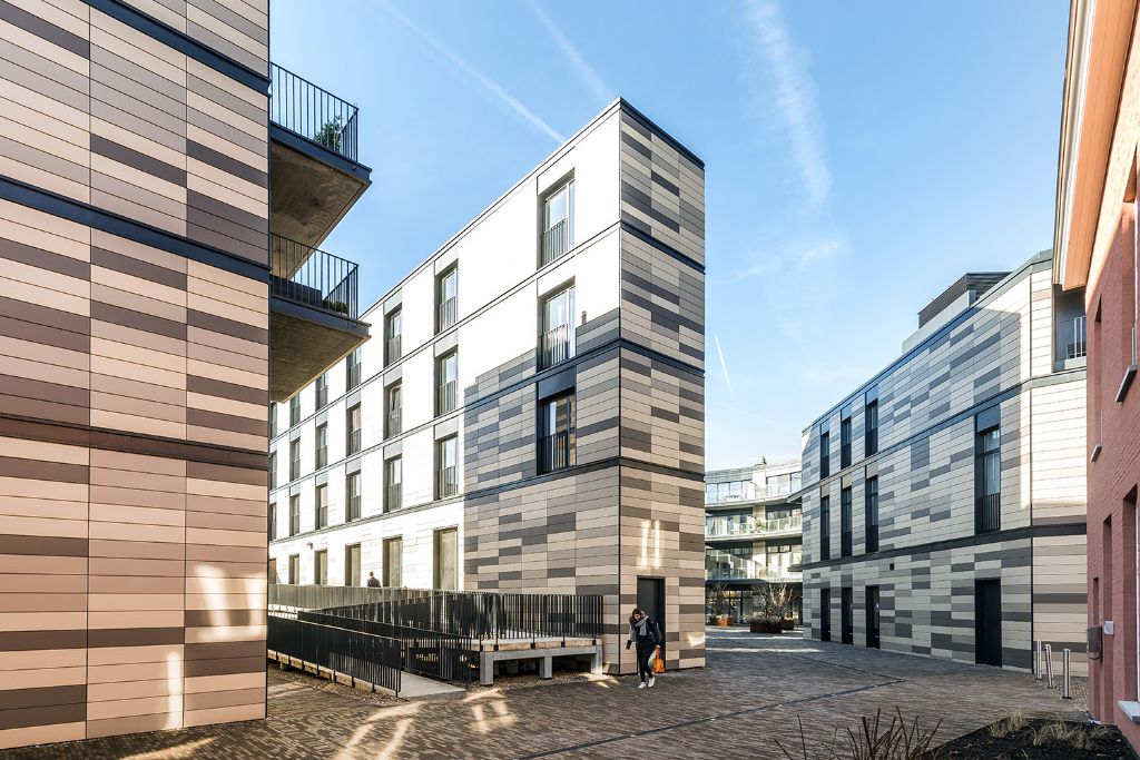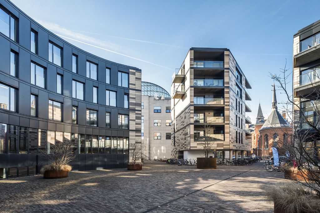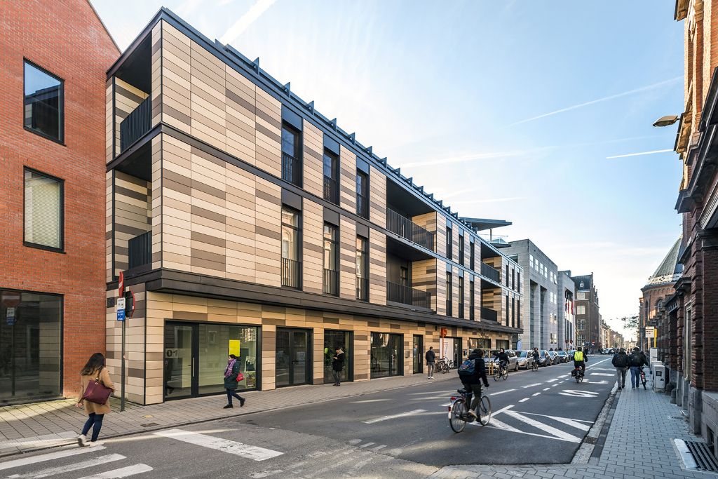 Het Vesalius-project blinkt uit door zijn specifieke functiemix. Een expliciete eis van het stadsbestuur, dat maar al te goed besefte dat het zaak was om het zuidoostelijke gedeelte van de Leuvense binnenring nieuw leven in te blazen. “De Vesaliusstraat was lang de gevoelsmatige grens van het historische centrum. Wie niet naar de les moest, had er weinig te zoeken – dat was zelfs ‘in mijn tijd’ al het geval. Met het Vesalius-project wilde de stad ook in het tweede deel van de Tiensestraat een unieke sociale dynamiek creëren”, legt architect John Eyers (CEO bij Jaspers-Eyers Architects) uit. Het ruimtelijke structuurplan stipuleerde dat de site absoluut een onderwijsfunctie moest bevatten, inclusief een gemengd woon- en handelscomplex. “De onderlinge interactie tussen de plaatselijke bewoners, de handels- en horecazaken en de af en aan lopende studenten moest ervoor zorgen dat er een nieuw bruisend stadsdeel ontstond.”