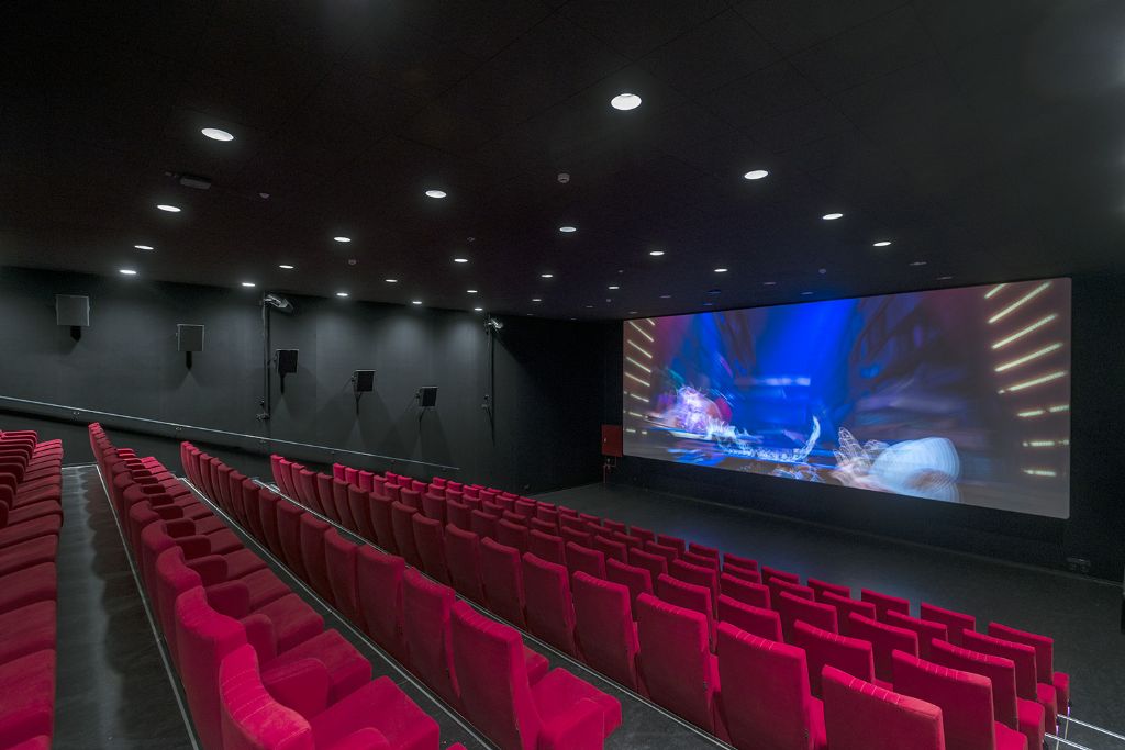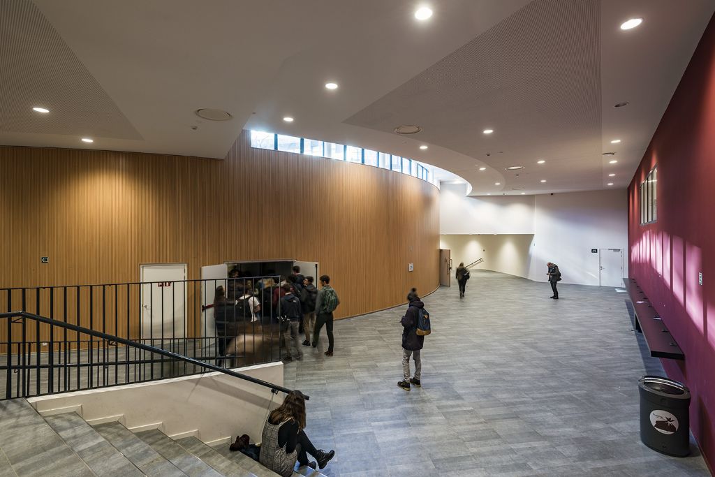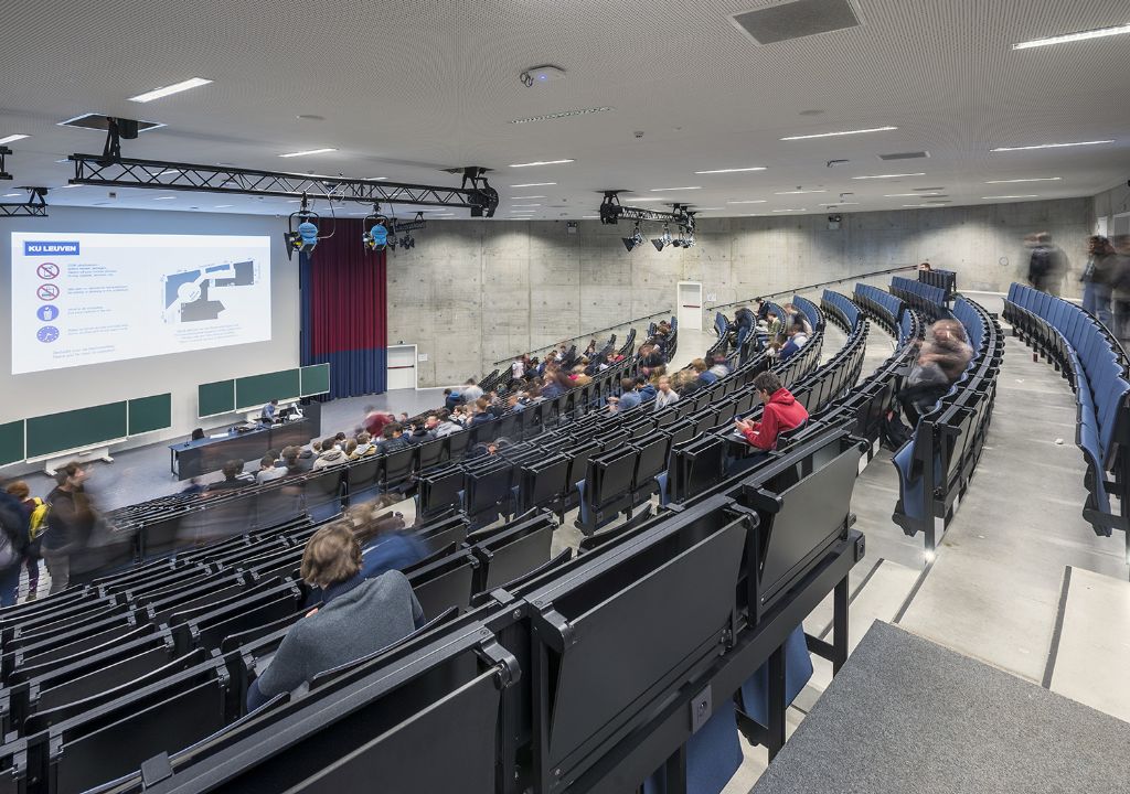 Vermits al snel duidelijk werd dat het moeilijk zou worden om de beoogde functiemix volledig bovengronds te realiseren, besliste het projectteam om het auditorium en de filmzalen onder te brengen op de ondergrondse verdieping. “Een cruciale beslissing”, benadrukt Kristof Vanfleteren. “De verplichte onderwijsfunctie was lang de achilleshiel van het project, maar via de bouw van het ondergrondse auditorium (capaciteit: 750 personen) hebben we die eis uitstekend ingevuld. Door ook de filmzalen en de kantoren van Fonk vzw op niveau -1 te vestigen, gaven we de zone onder het maaiveld een extra dimensie.” Bovendien hebben studenten en cinemabezoekers allerminst het gevoel dat ze in een kelder terechtkomen. “Via de uitstekende integratie van de brede inkompartij hebben we er namelijk voor gezorgd dat het erg natuurlijk aanvoelt om vanuit de Vesaliusstraat de trap naar beneden te nemen”, aldus John Eyers.