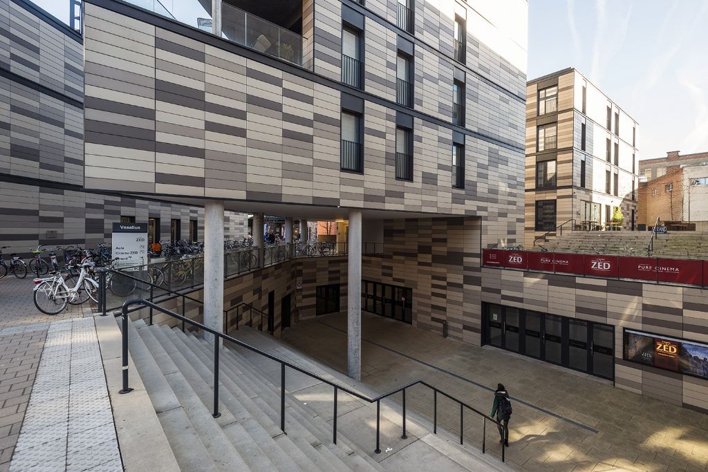 Het bleef echter niet bij een auditorium, diverse woningen en tal van handels- en horecazaken. Het complex biedt immers ook plaats aan twee filmzalen van Cinema ZED. “We zijn in 2002 zeer kleinschalig begonnen als ‘Leuvens filmhuis’ voor cinefielen – met slechts één filmzaaltje in kunstencentrum STUK – maar zagen ons filmaanbod fors uitbreiden na de sluiting van de Studio Filmtheaters (2010) en hadden plots nood aan extra zalen”, vertelt Johan Van Schaeren, algemeen coördinator bij Fonk vzw, dat Cinema ZED uitbaat. “In eerste instantie bleek een bioscoop op de site veel te duur, maar naderhand heeft toenmalig burgemeester Louis Tobback het idee nieuw leven ingeblazen door te opperen dat we de krachten konden bundelen met de universiteit. Hoewel we wat water bij de wijn moesten doen en vrede moesten nemen met twee nieuwe filmzalen in plaats van drie, zagen we dat wel zitten en is het plan uiteindelijk ook zo uitgewerkt.”